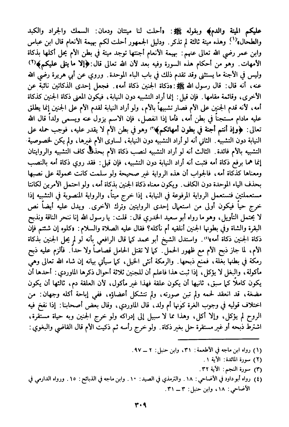 «3» وهو في بطن الأم لا يقدر عليه، فوجب حمله على النيابة دون التشبيه. الثاني أنه لو أراد التشبيه دون النيابة، لساوى الأم غيرها، ولم يكن لخصوصية التشبيه بالأم فائدة. الثالث أنه لو أراد التشبيه لنصب ذكاة الأم بحذف كاف التشبيه والروايتان إنما هما برفع ذكاة أمه فثبت أنه أراد النيابة دون التشبيه، فإن قيل: فقد روي ذكاة أمه بالنصب ومعناها كذكاة أمه، فالجواب أن هذه الرواية غير صحيحة ولو سلمت كانت محمولة على نصبها بحذف الياء الموحدة دون الكاف. ويكون معناه ذكاة الجنين بذكاة أمه، ولو احتمل الأمرين لكانتا مستعملتين فتستعمل الرواية المرفوعة في النيابة، إذا خرج ميتا، والرواية المنصوبة في التشبيه إذا خرج حيا فيكون أولى من استعمال إحدى الروايتين وترك الأخرى. ويدل عليه أيضا نص لا يحتمل التأويل، وهو ما رواه أبو سعيد الخدري قال: قلت: يا رسول الله إنا ننحر الناقة ونذبح البقرة والشاة وفي بطونها الجنين أنلقيه أم نأكله؟ فقال عليه الصلاة والسلام: «كلوه إن شئتم فإن ذكاة الجنين ذكاة أمه» «4» . واستدل الشيخ أبو محمد كما قال الرافعي بأنه لو لم يحل الجنين بذكاة الأم، لما جاز ذبح الأم مع ظهور الحمل. كما لا تقتل الحامل قصاصا ولا حدا. فألزم عليه ذبح رمكة في بطنها بغلة، فمنع ذبحها. والرمكة أنثى الخيل، كما سيأتي بيانه إن شاء الله تعالى وهي مأكولة، والبغل لا يؤكل، إذا ثبت هذا فاعلم أن للجنين ثلاثة أحوال ذكرها الماوردي: أحدها أن يكون كاملا كما سبق، ثانيها أن يكون علقة فهذا غير مأكول، لأن العلقة دم، ثالثها أن يكون مضغة، قد انعقد لحمه ولم تبن صورته، ولم تتشكل أعضاؤه، ففي إباحة أكله وجهان: من اختلاف قوليه في وجوب الغرة كونها أم ولد، قال الماوردي، وقال بعض أصحابنا: إذا نفخ فيه الروح لم يؤكل، وإلا أكل، وهذا مما لا سبيل إلى إدراكه ولو خرج الجنين وبه حياة مستقرة، اشترط ذبحه أو غير مستقرة حل بغير ذكاة. ولو خرج رأسه ثم ذكيت الأم قال القاضي والبغوي:
