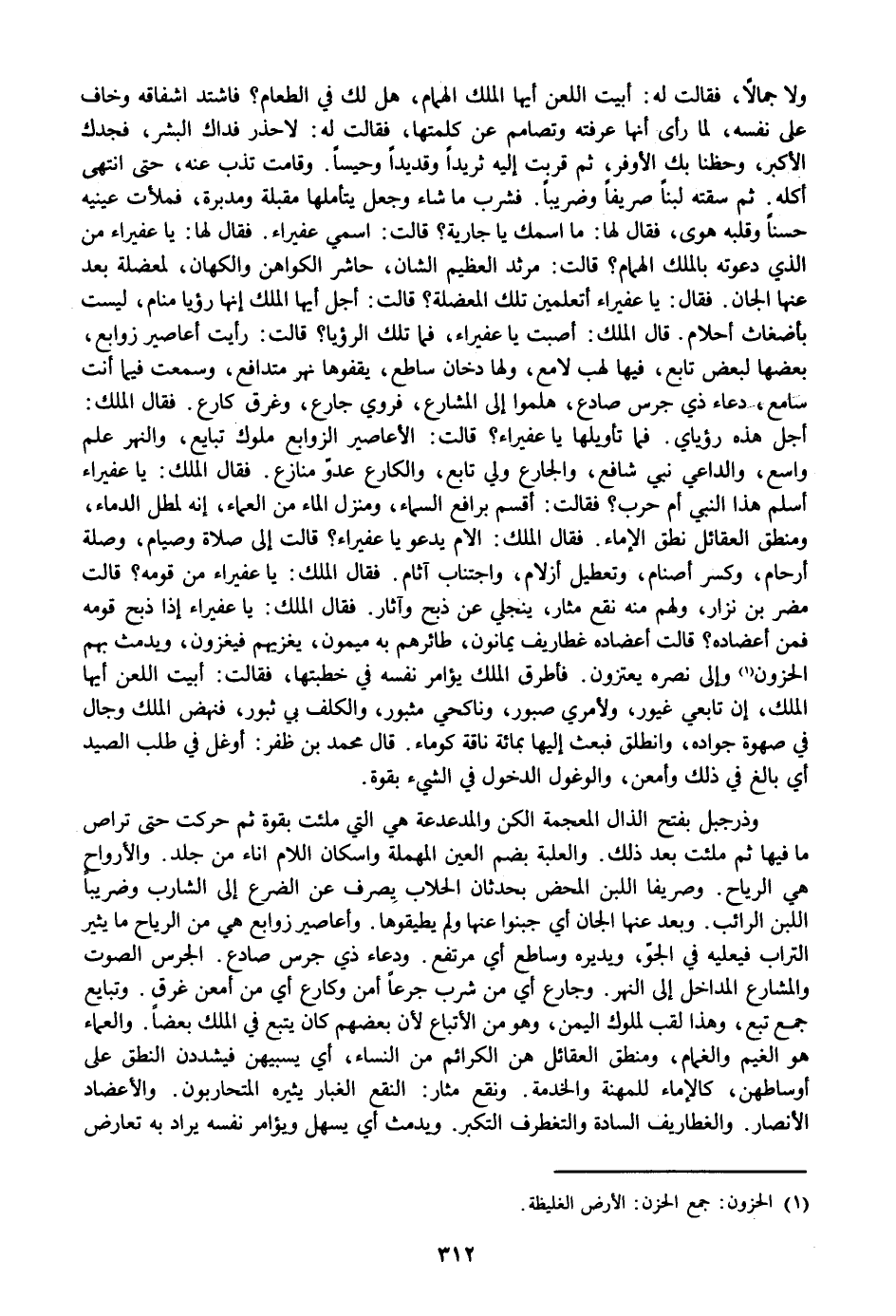 ولا جمالا، فقالت له: أبيت اللعن أيها الملك الهمام، هل لك في الطعام؟ فاشتد اشفاقه وخاف على نفسه، لما رأى أنها عرفته وتصامم عن كلمتها، فقالت له: لا حذر فداك البشر، فجدك الأكبر، وحظنا بك الأوفر، ثم قربت إليه ثريدا وقديدا وحيسا. وقامت تذب عنه، حتى انتهى أكله. ثم سقته لبنا صريفا وضريبا. فشرب ما شاء وجعل يتأملها مقبلة ومدبرة، فملأت عينيه حسنا وقلبه هوى، فقال لها: ما اسمك يا جارية؟ قالت: اسمي عفيراء. فقال لها: يا عفيراء من الذي دعوته بالملك الهمام؟ قالت: مرثد العظيم الشان، حاشر الكواهن والكهان، لمعضلة بعد عنها الجان. فقال: يا عفيراء أتعلمين تلك المعضلة؟ قالت: أجل أيها الملك إنها رؤيا منام، ليست بأضغاث أحلام. قال الملك: أصبت يا عفيراء، فما تلك الرؤيا؟ قالت: رأيت أعاصير زوابع، بعضها لبعض تابع، فيها لهب لامع، ولها دخان ساطع، يقفوها نهر متدافع، وسمعت فيما أنت سامع، دعاء ذي جرس صادع، هلموا إلى المشارع، فروي جارع، وغرق كارع. فقال الملك: