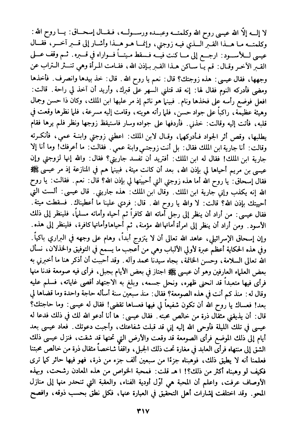 وكلمته ما هذا القبر الذي فيه زوجتي، وإنما هو هذا وأشار إلى قبر آخر، فقال عيسى للأسود: ارجع إلى ما كنت فيه فسقط ميتا فواراه في قبره. ثم وقف على القبر الآخر وقال: قم يا ساكن هذا القبر بإذن الله، فقامت المرأة وهي تنثر التراب عن وجهها، فقال عيسى: هذه زوجتك؟ قال: نعم يا روح الله. قال: خذ بيدها وانصرف. فأخذها ومضى فأدركه النوم فقال لها: إنه قد قتلني السهر على قبرك، وأريد أن آخذ لي راحة. قالت: