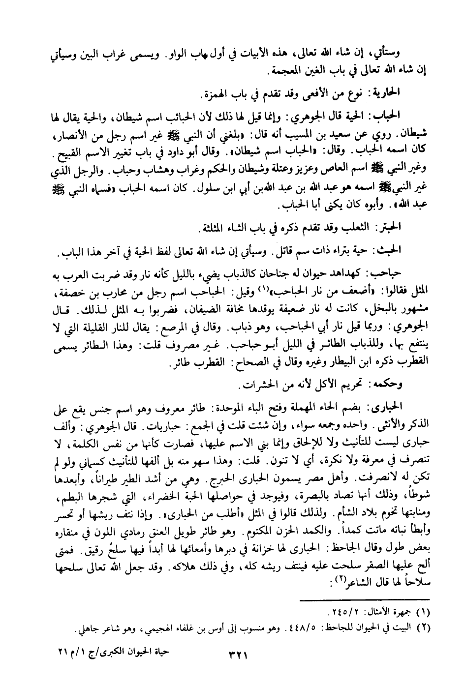 الحية قال الجوهري: وإنما قيل لها ذلك لأن الحبائب اسم شيطان، والحية يقال لها شيطان. روي عن سعيد بن المسيب أنه قال: «بلغني أن النبي صلى الله عليه وسلم غير اسم رجل من الأنصار، كان اسمه الحباب. وقال: «الحباب اسم شيطان» . وقال أبو داود في باب تغيير الاسم القبيح.