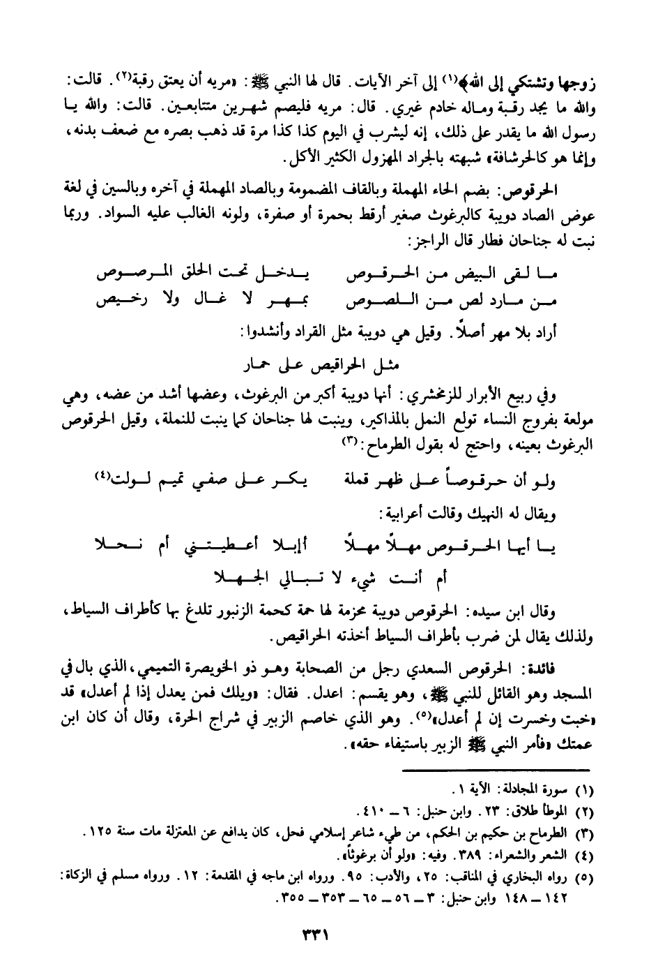 وفي ربيع الأبرار للزمخشري: أنها دويبة أكبر من البرغوث، وعضها أشد من عضه، وهي مولعة بفروج النساء تولع النمل بالمذاكير، وينبت لها جناحان كما ينبت للنملة، وقيل الحرقوص البرغوث بعينه، واحتج له بقول الطرماح: «3»