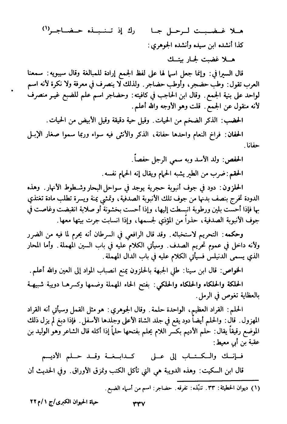 هلا غضبت لجار بيتك قال السيرافي: وإنما جعل اسما لها على لفظ الجمع إرادة للمبالغة وقال سيبويه: سمعنا العرب تقول: وطب حضجر، وأوطب حضاجر. ولذلك لا ينصرف في معرفة ولا نكرة لأنه اسم لواحد على بنية الجمع. وقال ابن الحاجب في كافيته: وحضاجر اسم علم للضبع غير منصرف لأنه منقول عن الجمع. قلت وهو الأوجه والله أعلم.