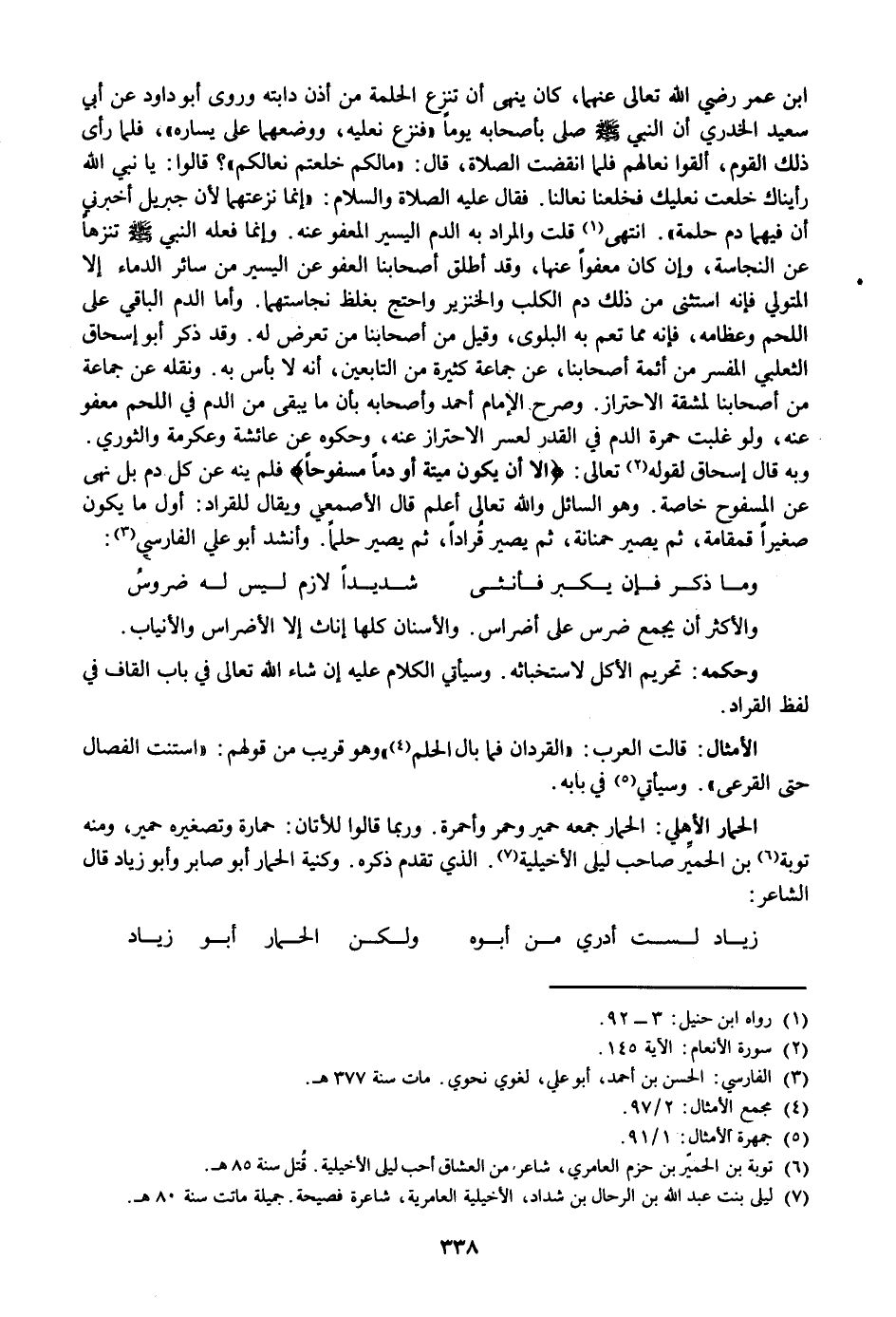 فلم ينه عن كل دم بل نهى عن المسفوح خاصة. وهو السائل والله تعالى أعلم قال الأصمعي ويقال للقراد: أول ما يكون صغيرا قمقامة، ثم يصير حمنانة، ثم يصير قرادا، ثم يصير حلما. وأنشد أبو علي الفارسي «3» :