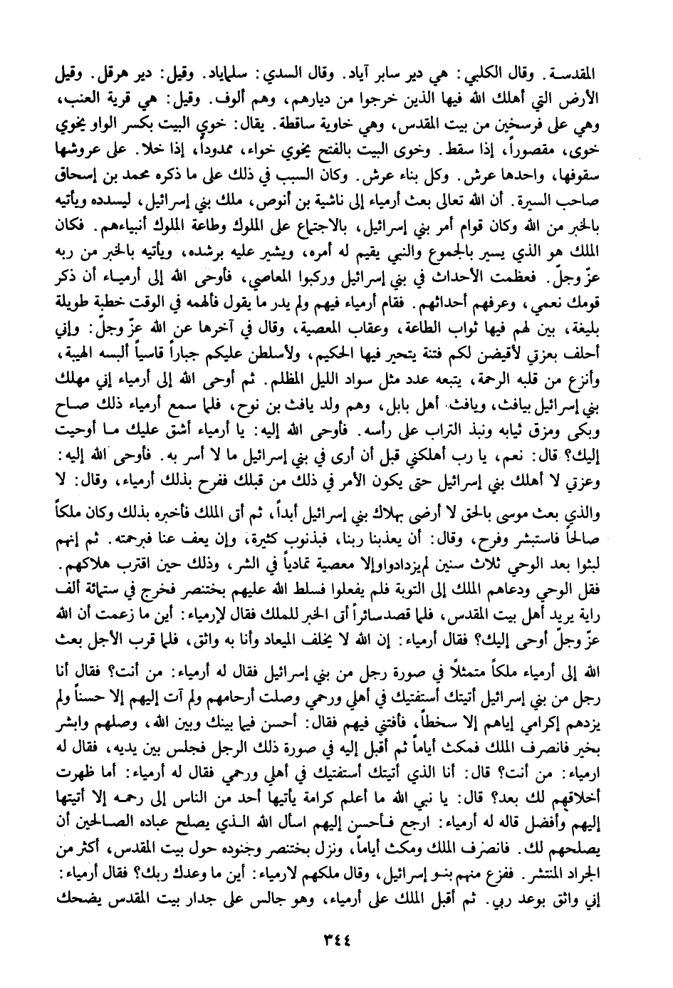 وعزتي لا أهلك بني إسرائيل حتى يكون الأمر في ذلك من قبلك ففرح بذلك أرمياء، وقال: لا والذي بعث موسى بالحق لا أرضى بهلاك بني إسرائيل أبدا، ثم أتى الملك فأخبره بذلك وكان ملكا صالحا فاستبشر وفرح، وقال: أن يعذبنا ربنا، فبذنوب كثيرة، وإن يعف عنا فبرحمته. ثم إنهم لبثوا بعد الوحي ثلاث سنين لم يزدادوا وإلا معصية تماديا في الشر، وذلك حين اقترب هلاكهم.