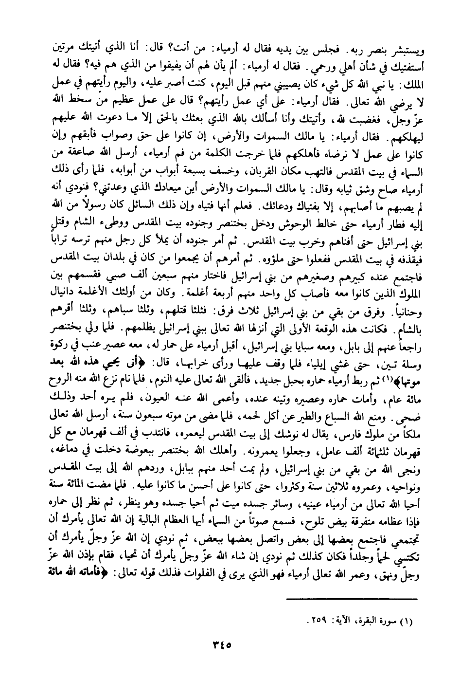 «1» ثم ربط أرمياء حماره بحبل جديد، فألقى الله تعالى عليه النوم، فلما نام نزع الله منه الروح مائة عام، وأمات حماره وعصيره وتينه عنده، وأعمى الله عنه العيون، فلم يره أحد وذلك ضحى. ومنع الله السباع والطير عن أكل لحمه، فلما مضى من موته سبعون سنة، أرسل الله تعالى ملكا من ملوك فارس، يقال له نوشك إلى بيت المقدس ليعمره، فانتدب في ألف قهرمان مع كل قهرمان ثلاثمائة ألف عامل، وجعلوا يعمرونه. وأهلك الله بختنصر ببعوضة دخلت في دماغه، ونجى الله من بقي من بني إسرائيل، ولم يمت أحد منهم ببابل، وردهم الله إلى بيت المقدس ونواحيه، وعمروه ثلاثين سنة وكثروا، حتى كانوا على أحسن ما كانوا عليه. فلما مضت المائة سنة أحيا الله تعالى من أرمياء عينيه، وسائر جسده ميت ثم أحيا جسده وهو ينظر، ثم نظر إلى حماره فإذا عظامه متفرقة بيض تلوح، فسمع صوتا من السماء أيها العظام البالية إن الله تعالى يأمرك أن تجتمعي فاجتمع بعضها إلى بعض واتصل بعضها ببعض، ثم نودي إن الله عزّ وجلّ يأمرك أن تكتسي لحما وجلدا فكان كذلك ثم نودي إن شاء الله عزّ وجلّ يأمرك أن تحيا، فقام بإذن الله عزّ وجلّ ونهق، وعمر الله تعالى أرمياء فهو الذي يرى في الفلوات فذلك قوله تعالى:
