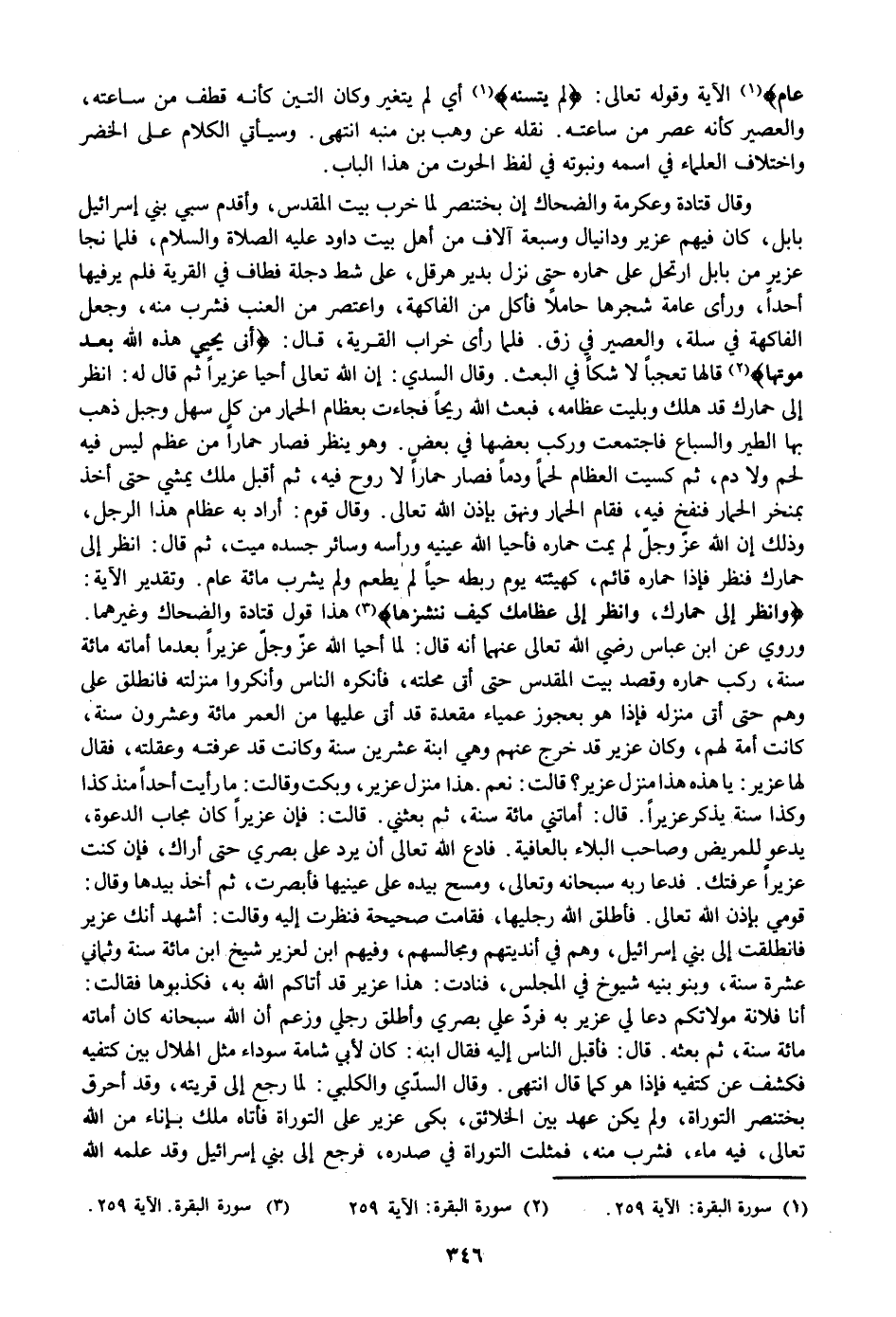 أنا فلانة مولاتكم دعا لي عزير به فردّ علي بصري وأطلق رجلي وزعم أن الله سبحانه كان أماته مائة سنة، ثم بعثه. قال: فأقبل الناس إليه فقال ابنه: كان لأبي شامة سوداء مثل الهلال بين كتفيه فكشف عن كتفيه فإذا هو كما قال انتهى. وقال السدّي والكلبي: لما رجع إلى قريته، وقد أحرق بختنصر التوراة، ولم يكن عهد بين الخلائق، بكى عزير على التوراة فأتاه ملك بإناء من الله تعالى، فيه ماء، فشرب منه، فمثلت التوراة في صدره، فرجع إلى بني إسرائيل وقد علمه الله