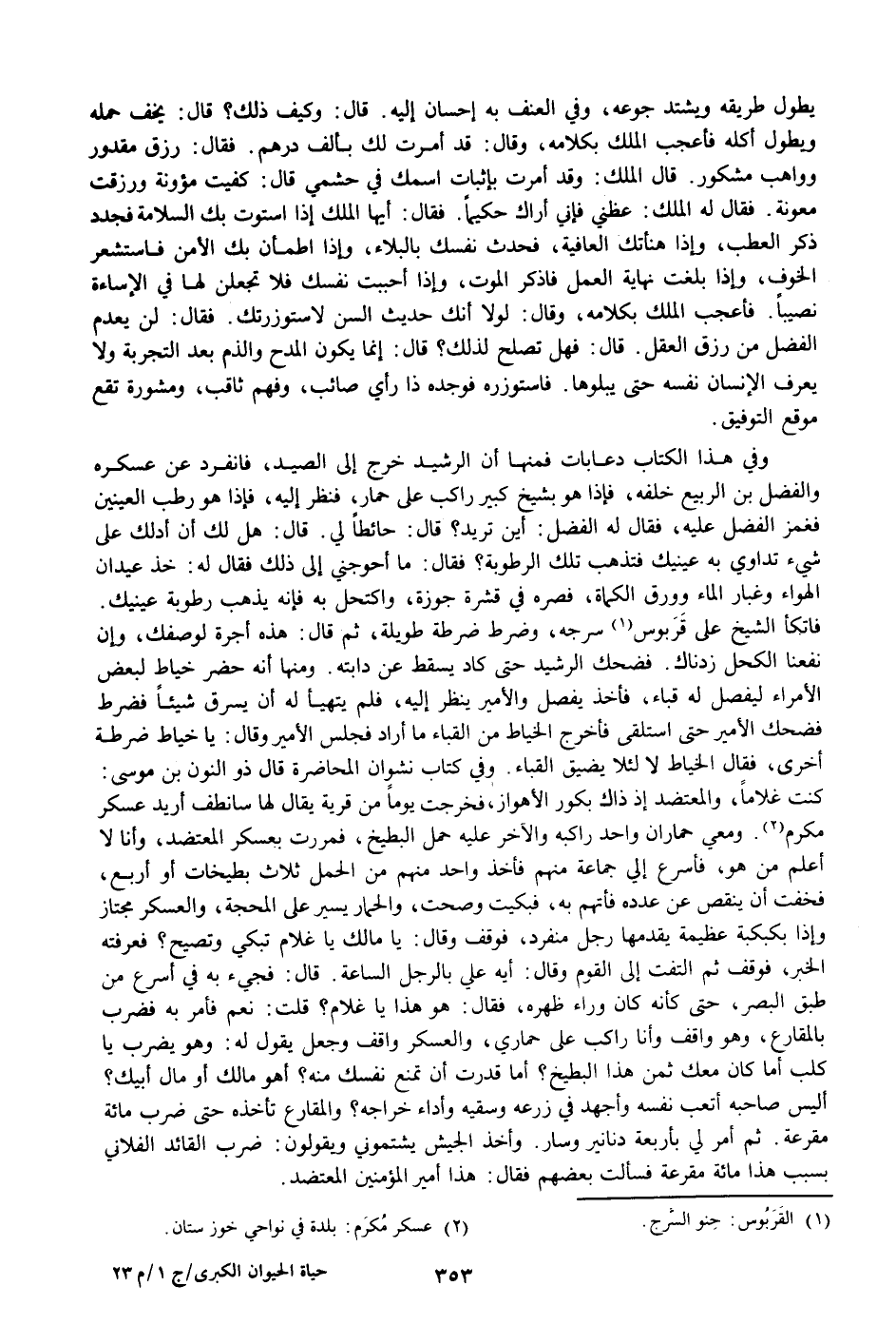 أليس صاحبه أتعب نفسه وأجهد في زرعه وسقيه وأداء خراجه؟ والمقارع تأخذه حتى ضرب مائة مقرعة. ثم أمر لي بأربعة دنانير وسار. وأخذ الجيش يشتموني ويقولون: ضرب القائد الفلاني بسبب هذا مائة مقرعة فسألت بعضهم فقال: هذا أمير المؤمنين المعتضد.