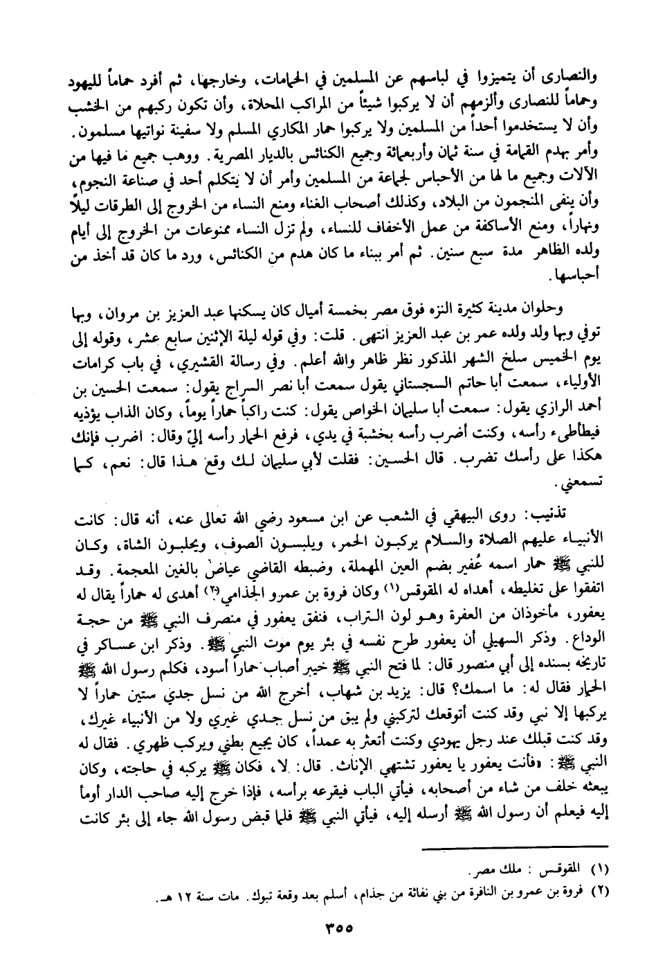 والنصارى أن يتميزوا في لباسهم عن المسلمين في الحمامات، وخارجها، ثم أفرد حماما لليهود وحماما للنصارى وألزمهم أن لا يركبوا شيئا من المراكب المحلاة، وأن تكون ركبهم من الخشب وأن لا يستخدموا أحدا من المسلمين ولا يركبوا حمار المكاري المسلم ولا سفينة نواتيها مسلمون.