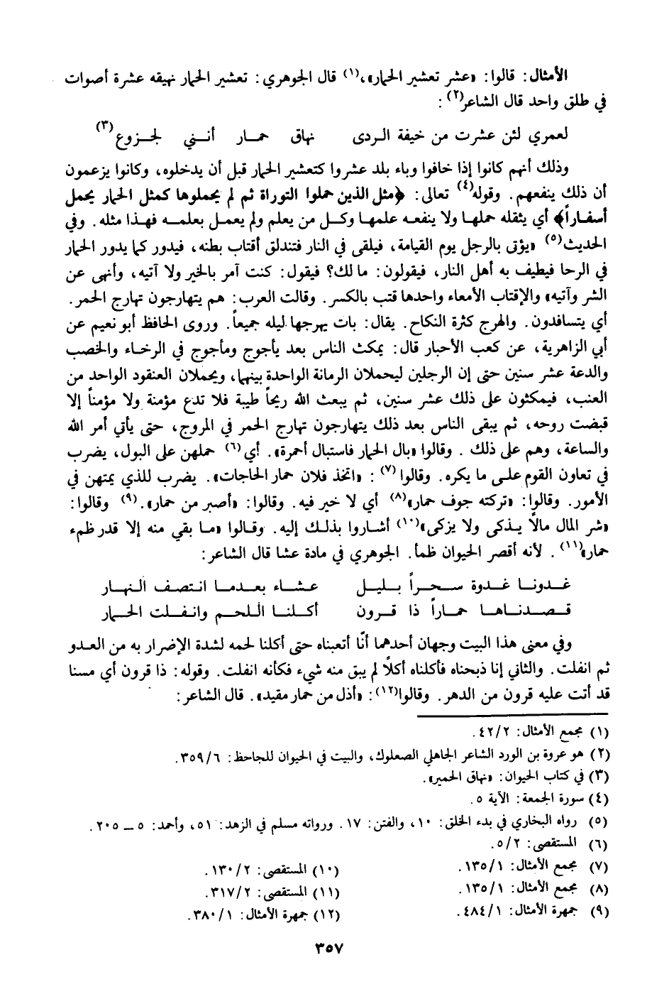 وذلك أنهم كانوا إذا خافوا وباء بلد عشروا كتعشير الحمار قبل أن يدخلوه، وكانوا يزعمون أن ذلك ينفعهم. وقوله «4» تعالى: مَثَلُ الَّذِينَ حُمِّلُوا التَّوْراةَ ثُمَّ لَمْ يَحْمِلُوها كَمَثَلِ الْحِمارِ يَحْمِلُ أَسْفاراً