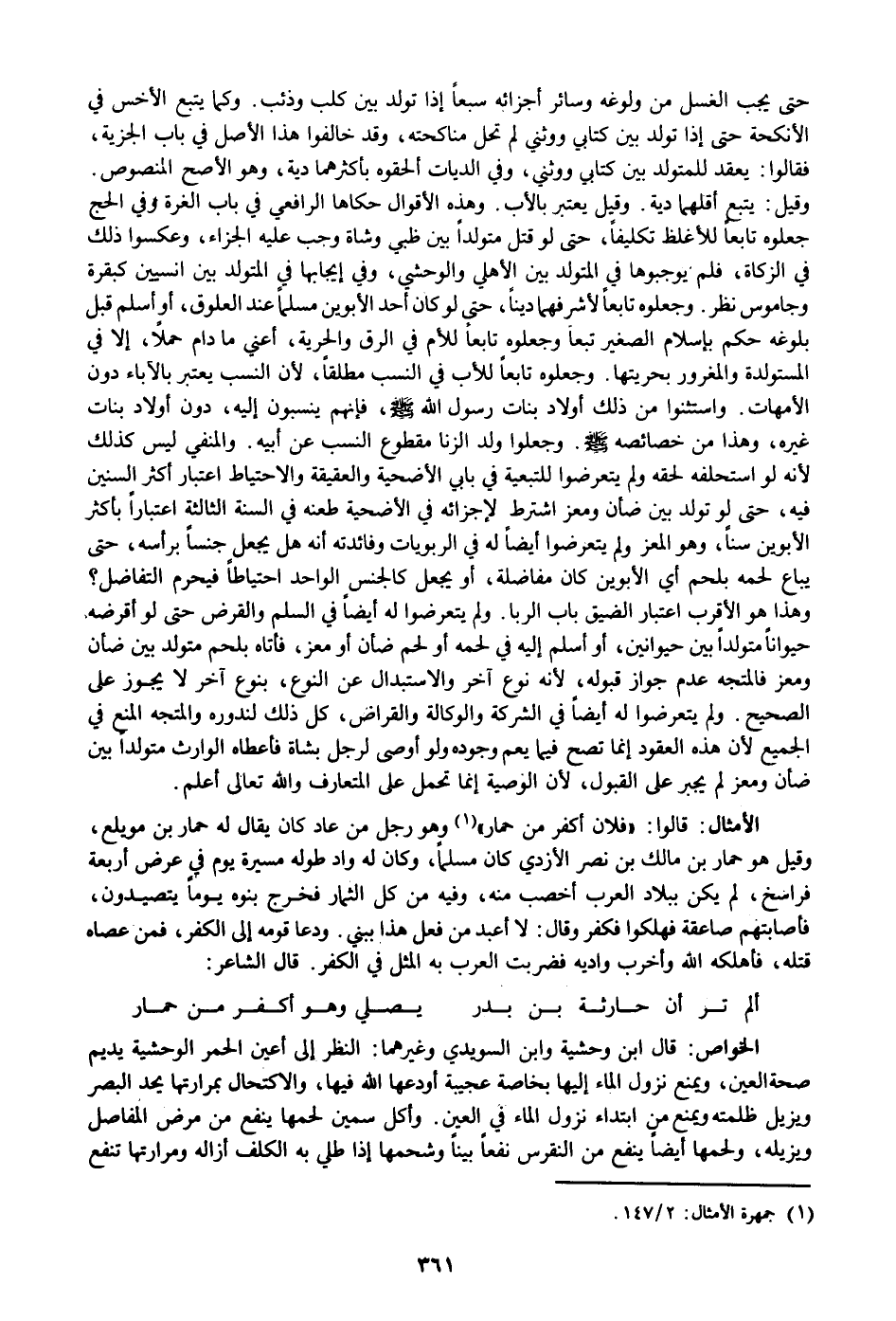 حتى يجب الغسل من ولوغه وسائر أجزائه سبعا إذا تولد بين كلب وذئب. وكما يتبع الأخس في الأنكحة حتى إذا تولد بين كتابي ووثني لم تحل مناكحته، وقد خالفوا هذا الأصل في باب الجزية، فقالوا: يعقد للمتولد بين كتابي ووثني، وفي الديات ألحقوه بأكثرهما دية، وهو الأصح المنصوص.