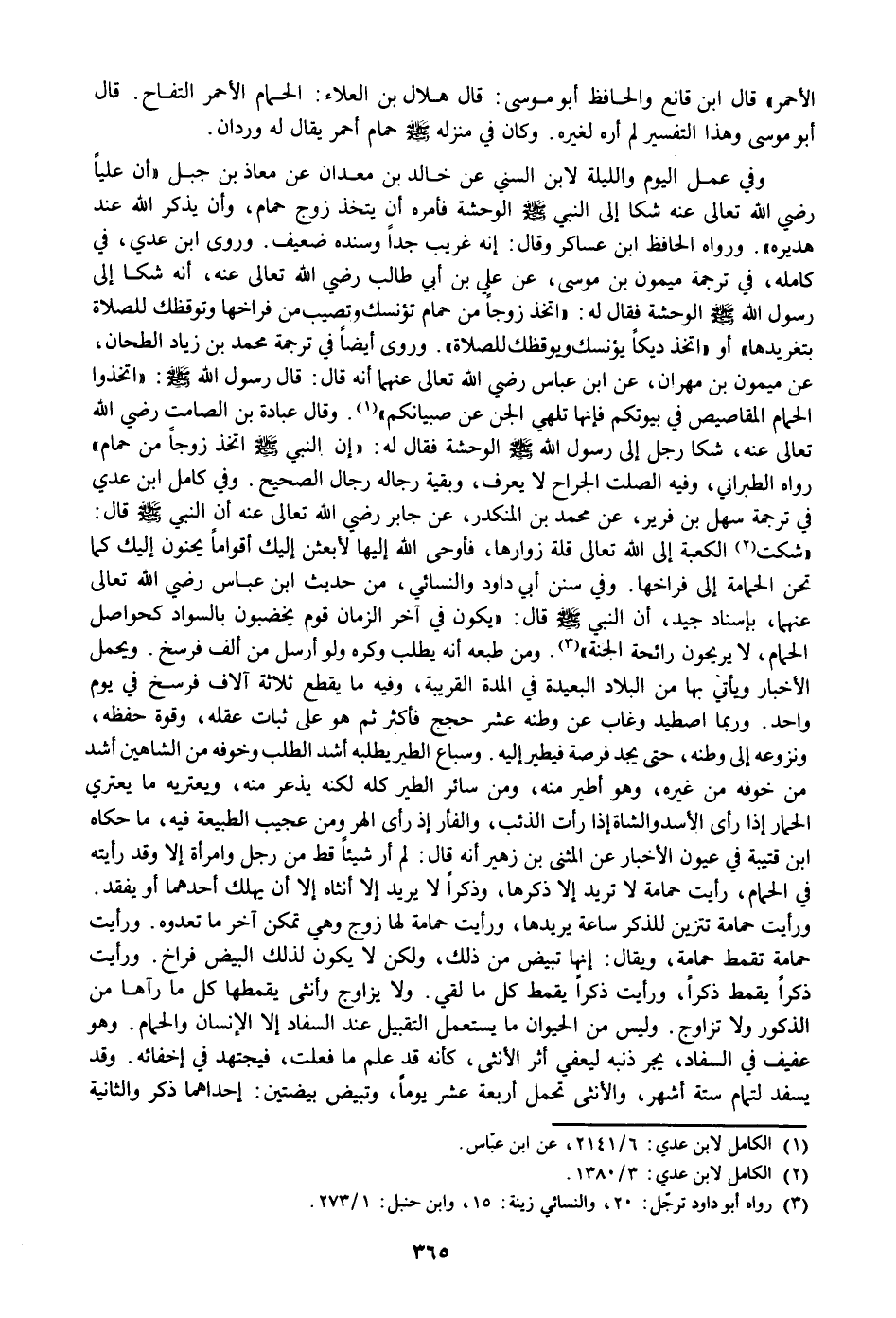 وفي عمل اليوم والليلة لابن السني عن خالد بن معدان عن معاذ بن جبل «أن عليا رضي الله تعالى عنه شكا إلى النبي صلى الله عليه وسلم الوحشة فأمره أن يتخذ زوج حمام، وأن يذكر الله عند هديره» . ورواه الحافظ ابن عساكر وقال: إنه غريب جدا وسنده ضعيف. وروى ابن عدي، في كامله، في ترجمة ميمون بن موسى، عن علي بن أبي طالب رضي الله تعالى عنه، أنه شكا إلى رسول الله صلى الله عليه وسلم الوحشة فقال له: «اتخذ زوجا من حمام تؤنسك وتصيب من فراخها وتوقظك للصلاة بتغريدها» أو «اتخذ ديكا يؤنسك ويوقظك للصلاة» . وروى أيضا في ترجمة محمد بن زياد الطحان، عن ميمون بن مهران، عن ابن عباس رضي الله تعالى عنهما أنه قال: قال رسول الله صلى الله عليه وسلم: «اتخذوا الحمام المقاصيص في بيوتكم فإنها تلهي الجن عن صبيانكم» «1» . وقال عبادة بن الصامت رضي الله تعالى عنه، شكا رجل إلى رسول الله صلى الله عليه وسلم الوحشة فقال له: «إن النبي صلى الله عليه وسلم اتخذ زوجا من حمام» رواه الطبراني، وفيه الصلت الجراح لا يعرف، وبقية رجاله رجال الصحيح. وفي كامل ابن عدي في ترجمة سهل بن فرير، عن محمد بن المنكدر، عن جابر رضي الله تعالى عنه أن النبي صلى الله عليه وسلم قال: