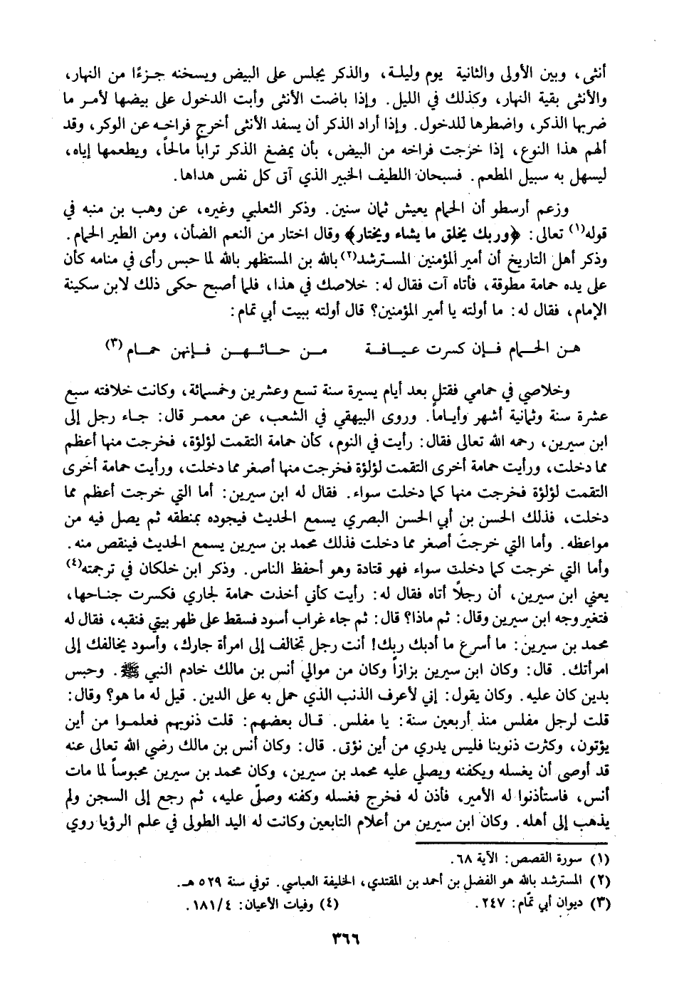وأما التي خرجت كما دخلت سواء فهو قتادة وهو أحفظ الناس. وذكر ابن خلكان في ترجمته «4» يعني ابن سيرين، أن رجلا أتاه فقال له: رأيت كأني أخذت حمامة لجاري فكسرت جناحها، فتغير وجه ابن سيرين وقال: ثم ماذا؟ قال: ثم جاء غراب أسود فسقط على ظهر بيتي فنقبه، فقال له محمد بن سيرين: ما أسرع ما أدبك ربك! أنت رجل تخالف إلى امرأة جارك، وأسود يخالفك إلى امرأتك. قال: وكان ابن سيرين بزازا وكان من موالي أنس بن مالك خادم النبي صلى الله عليه وسلم. وحبس بدين كان عليه. وكان يقول: إني لأعرف الذنب الذي حمل به على الدين. قيل له ما هو؟ وقال:
