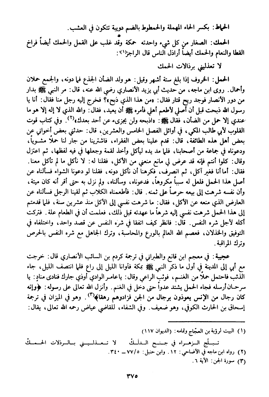 الخروف إذا بلغ ستة أشهر وقيل: هو ولد الضأن الجذع فما دونه، والجمع حملان وأحمال. روى ابن ماجه، من حديث أبي يزيد الأنصاري رضي الله عنه، قال: مر النبي صلى الله عليه وسلم بدار من دور الأنصار فوجد ريح قتار فقال: «من هذا الذي ذبح» ؟ فخرج إليه رجل منا فقال: أنا يا رسول الله ذبحت قبل أن أصلي لأطعم أهلي فأمره صلى الله عليه وسلم أن يعيد، فقال: والله الذي لا إله إلا هو ما عندي إلا حمل من الضأن، فقال صلى الله عليه وسلم: «اذبحه ولن يجزىء عن أحد بعدك» «2» . وفي كتاب قوت القلوب لأبي طالب المكي، في أوائل الفصل الخامس والعشرين، قال: حدثني بعض أخواني عن بعض أهل هذه الطائفة، قال: قدم علينا بعض الفقراء، فاشترينا من جار لنا حملا مشويا، ودعوناه في جماعة من أصحابنا، فلما مد يده ليأكل وأخذ لقمة وجعلها في فيه لفظها، ثم اعتزل وقال: كلوا أنتم فإنه قد عرض لي مانع منعني من الأكل، فقلنا له: لا نأكل ما لم تأكل معنا.