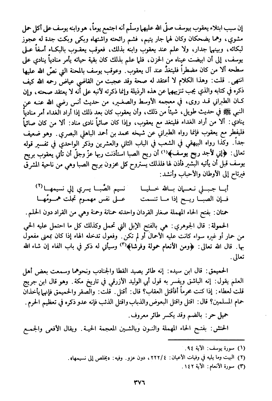«1» أن ريح الصبا استأذنت ربها عزّ وجلّ أن تأتي يعقوب بريح يوسف قبل أن يأتيه البشير فأذن لها فلذلك يستروح كل محزون بريح الصبا وهي من ناحية المشرق فيرتاح إلى الأوطان والأحباب وأنشد: