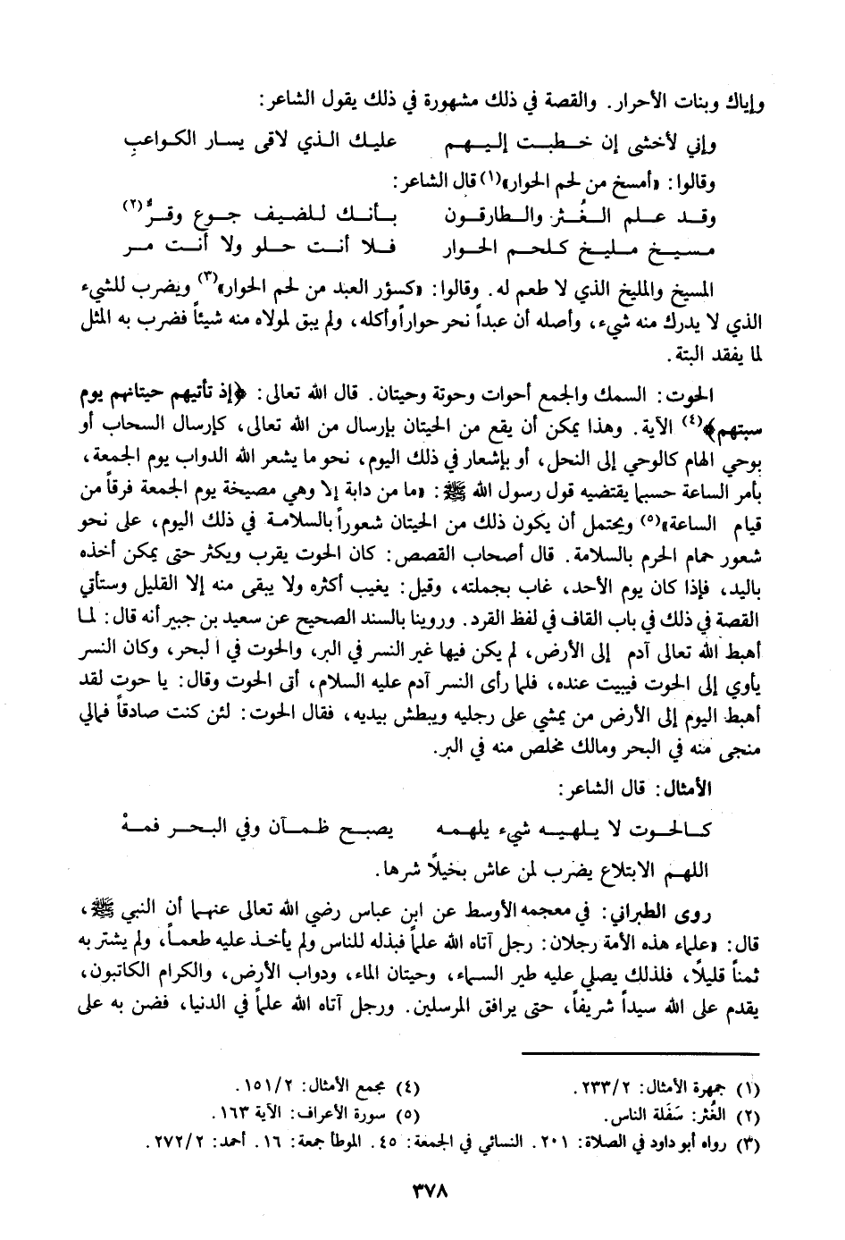 «4» الآية. وهذا يمكن أن يقع من الحيتان بإرسال من الله تعالى، كإرسال السحاب أو بوحي الهام كالوحي إلى النحل، أو بإشعار في ذلك اليوم، نحو ما يشعر الله الدواب يوم الجمعة، بأمر الساعة حسبما يقتضيه قول رسول الله صلى الله عليه وسلم: «ما من دابة إلا وهي مصيخة يوم الجمعة فرقا من قيام الساعة» «5» ويحتمل أن يكون ذلك من الحيتان شعورا بالسلامة في ذلك اليوم، على نحو شعور حمام الحرم بالسلامة. قال أصحاب القصص: كان الحوت يقرب ويكثر حتى يمكن أخذه باليد، فإذا كان يوم الأحد، غاب بجملته، وقيل: يغيب أكثره ولا يبقى منه إلا القليل وستأتي القصة في ذلك في باب القاف في لفظ القرد. وروينا بالسند الصحيح عن سعيد بن جبير أنه قال: لما أهبط الله تعالى آدم إلى الأرض، لم يكن فيها غير النسر في البر، والحوت في البحر، وكان النسر يأوي إلى الحوت فيبيت عنده، فلما رأى النسر آدم عليه السلام، أتى الحوت وقال: يا حوت لقد أهبط اليوم إلى الأرض من يمشي على رجليه ويبطش بيديه، فقال الحوت: لئن كنت صادقا فمالي منجى منه في البحر ومالك مخلص منه في البر.