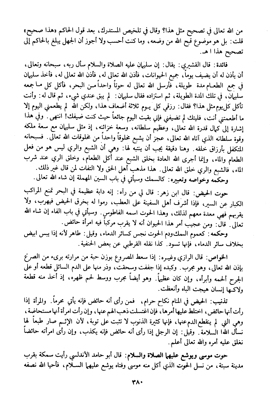 قال ابن زهر: قال لي من رآه: إنه دابة عظيمة في البحر تمنع المراكب الكبار عن السير، فإذا أشرف أهل السفينة على العطب، رموا له بخرق الحيض فيهرب، ولا يقربهم فهي معدة معهم لذلك، وهذا الحوت اسمه الفاطوس. وسيأتي في باب الفاء إن شاء الله تعالى. قال: ومن عجيب أمر هذا الحيوان أنه لا يقرب مركبا فيه امرأة حائض.