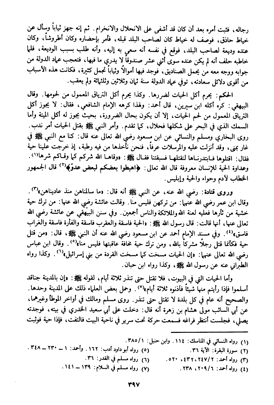 وأما الحيات التي في البيوت، فلا تقتل حتى تنذر ثلاثة أيام، لقوله صلى الله عليه وسلم: «إن بالمدينة جناقد أسلموا فإذا رأيتم منها شيئا فآذنوه ثلاثة أيام» «7» . وحمل بعض العلماء ذلك على المدينة وحدها.