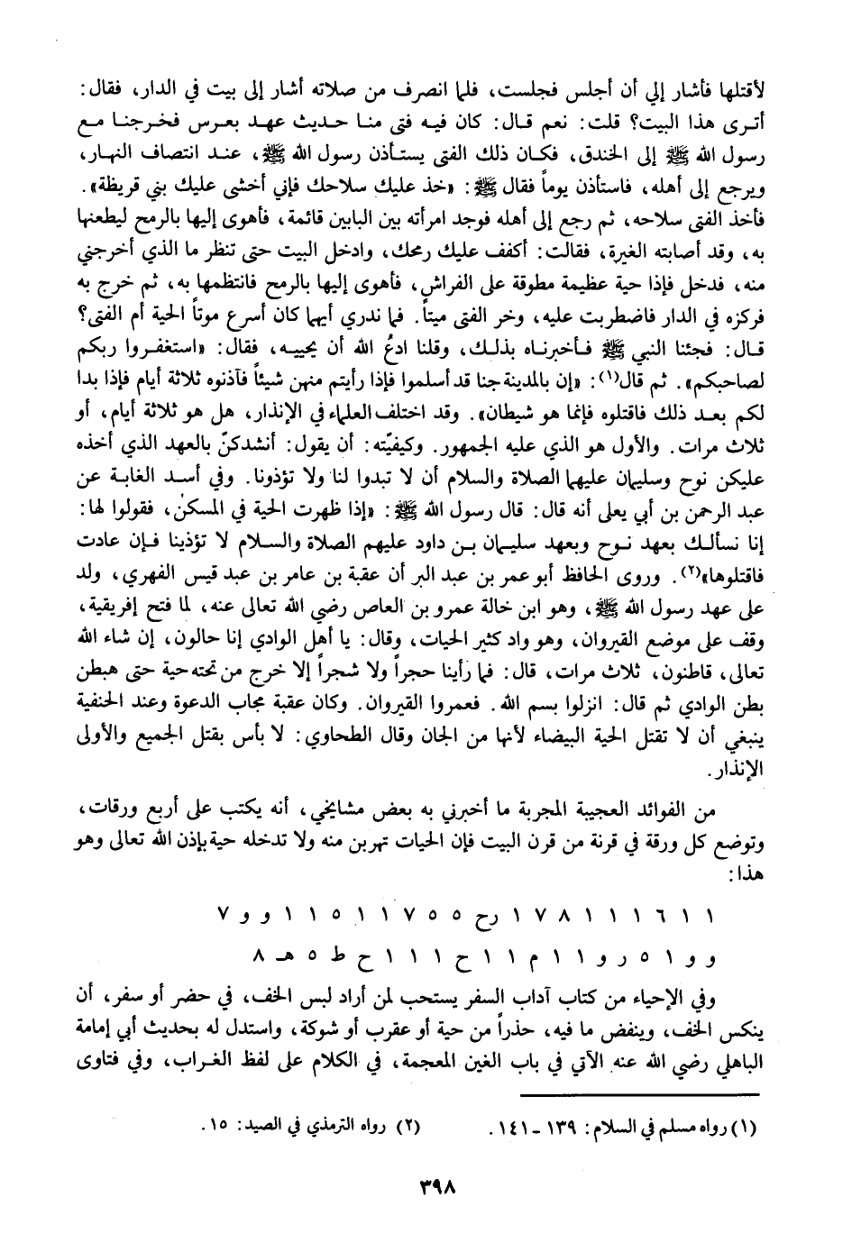 إنا نسألك بعهد نوح وبعهد سليمان بن داود عليهم الصلاة والسلام لا تؤذينا فإن عادت فاقتلوها» «2» . وروى الحافظ أبو عمر بن عبد البر أن عقبة بن عامر بن عبد قيس الفهري، ولد على عهد رسول الله صلى الله عليه وسلم، وهو ابن خالة عمرو بن العاص رضي الله تعالى عنه، لما فتح إفريقية، وقف على موضع القيروان، وهو واد كثير الحيات، وقال: يا أهل الوادي إنا حالون، إن شاء الله تعالى، قاطنون، ثلاث مرات، قال: فما رأينا حجرا ولا شجرا إلا خرج من تحته حية حتى هبطن بطن الوادي ثم قال: انزلوا بسم الله. فعمروا القيروان. وكان عقبة مجاب الدعوة وعند الحنفية ينبغي أن لا تقتل الحية البيضاء لأنها من الجان وقال الطحاوي: لا بأس بقتل الجميع والأولى الإنذار.