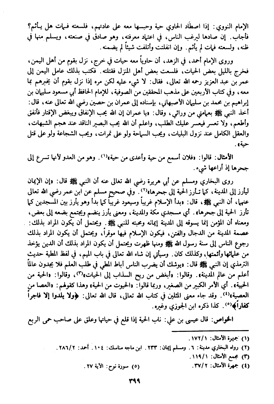 عصمة المدينة من الدجال والفتن، فيكون الإسلام فيها موقرا، ويحتمل أن يكون المراد بذلك رجوع الناس إلى سنة رسول الله صلى الله عليه وسلم ومنها ظهرت ويحتمل أن يكون المراد بذلك أن الدين يؤخذ من علمائها وأئمتها، وكذلك كان. وسيأتي إن شاء الله تعالى في باب الميم، في لفظ المطية حديث الترمذي إن النبي صلى الله عليه وسلم قال: «يوشك أن يضرب الناس آباط المطي في طلب العلم فلا يجدون عالما أعلم من عالم المدينة» . وقالوا: «أبغض من ريح السذاب إلى الحيات» «3» ، وقالوا: «الحية من الحيية» . أي الأمر الكبير من الصغير، وربما قالوا: «الحيوت من الحية» وهذا كقولهم: «العصا من العصية» «4» . وقد جاء معنى المثلين في كتاب الله تعالى، قال الله تعالى: وَلا يَلِدُوا إِلَّا فاجِراً كَفَّاراً