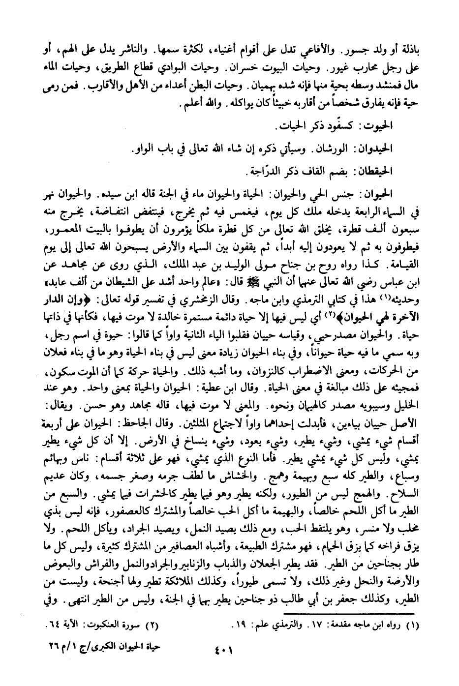 الأصل حييان بياءين، فأبدلت إحداهما واوا لاجتماع المثلثين. وقال الجاحظ: الحيوان على أربعة أقسام شيء يمشي، وشيء يطير، وشيء يعود، وشيء ينساخ في الأرض. إلا أن كل شيء يطير يمشي، وليس كل شيء يمشي يطير. فأما النوع الذي يمشي، فهو على ثلاثة أقسام: ناس وبهائم وسباع، والطير كله سبع وبهيمة وهمج. والخشاش ما لطف جرمه وصغر جسمه، وكان عديم السلاح. والهمج ليس من الطيور، ولكنه يطير وهو فيما يطير كالحشرات فيما يمشي. والسبع من الطير ما أكل اللحم خالصا، والبهيمة ما أكل الحب خالصا والمشترك كالعصفور، فإنه ليس بذي مخلب ولا منسر، وهو يلتقط الحب، ومع ذلك يصيد النمل، ويصيد الجراد، ويأكل اللحم. ولا يزق فراخه كما يزق الحمام، فهو مشترك الطبيعة، وأشباه العصافير من المشترك كثيرة، وليس كل ما طار بجناحين من الطير. فقد يطير الجعلان والذباب والزنابير والجراد والنمل والفراش والبعوض والأرضة والنحل وغير ذلك، ولا تسمى طيورا، وكذلك الملائكة تطير ولها أجنحة، وليست من الطير، وكذلك جعفر بن أبي طالب ذو جناحين يطير بهما في الجنة، وليس من الطير انتهى. وفي