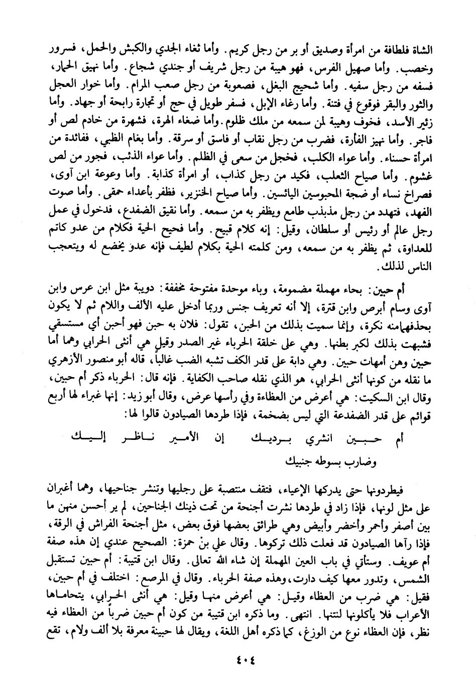 وضارب بسوطه جنبيك فيطردونها حتى يدركها الإعياء، فتقف منتصبة على رجليها وتنشر جناحيها، وهما أغبران على مثل لونها، فإذا زاد في طردها نشرت أجنحة من تحت ذينك الجناحين، لم ير أحسن منهن ما بين أصفر وأحمر وأخضر وأبيض وهي طرائق بعضها فوق بعض، مثل أجنحة الفراش في الرقة، فإذا رآها الصيادون قد فعلت ذلك تركوها. وقال علي بن حمزة: الصحيح عندي إن هذه صفة أم عويف. وستأتي في باب العين المهملة إن شاء الله تعالى. وقال ابن قتيبة: أم حبين تستقبل الشمس، وتدور معها كيف دارت، وهذه صفة الحرباء. وقال في المرصع: اختلف في أم حبين، فقيل: هي ضرب من العظاء وقيل: هي أعرض منها وقيل: هي أنثى الحرابي، يتحاماها الأعراب فلا يأكلونها لنتنها. انتهى. وما ذكره ابن قتيبة من كون أم حبين ضربا من العظاء فيه نظر، فإن العظاء نوع من الوزغ، كما ذكره أهل اللغة، ويقال لها حبينة معرفة بلا ألف ولام، تقع