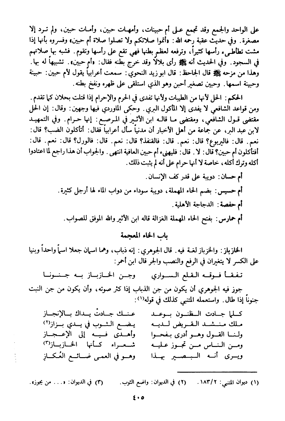 أفتأكلون أم حبين؟ قال: لا. قال: فليهنىء أم حبين العافية انتهى. والجواب أن هذا راجع لما اعتادوا أكله وترك أكله، خاصة لا أنها حرام على أنه لم يثبت ذلك.