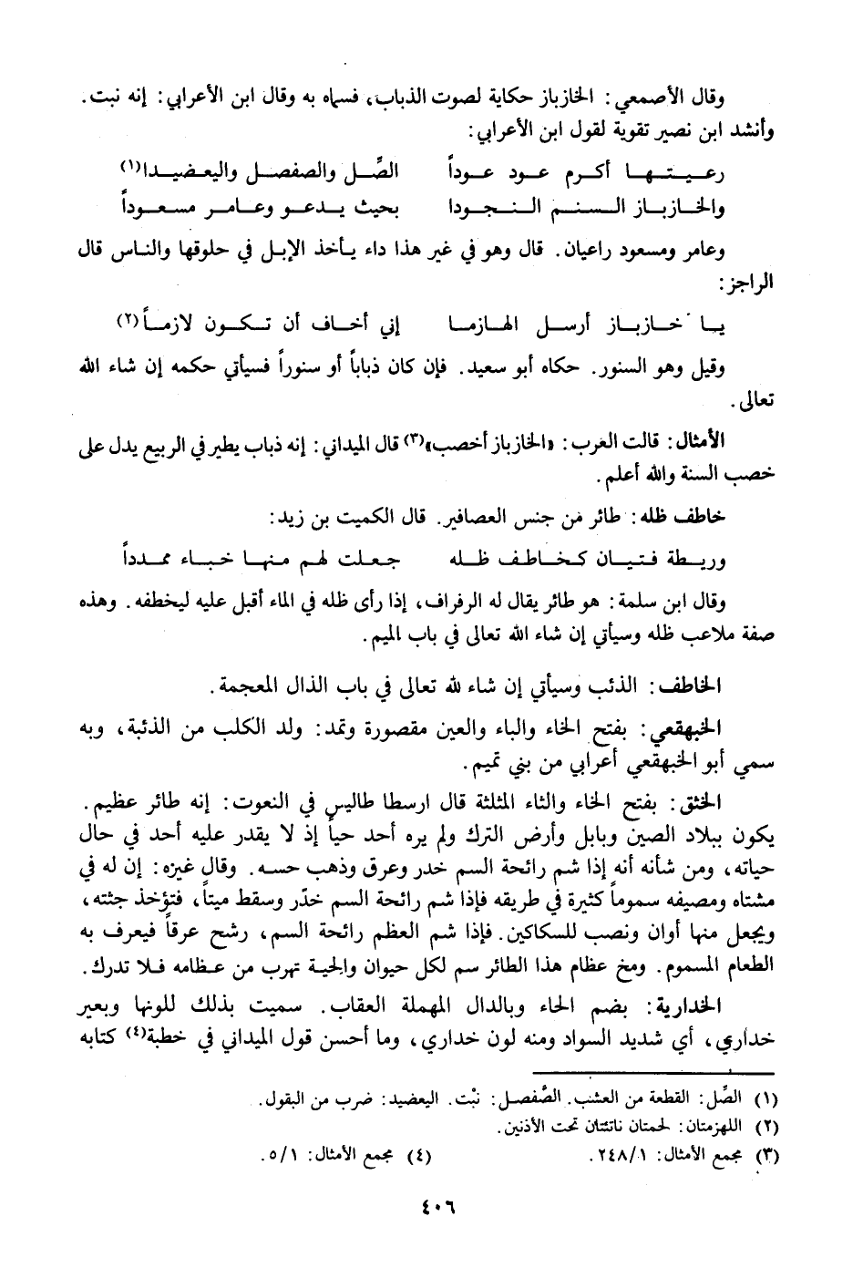 قالت العرب: «الخازباز أخصب» «3» قال الميداني: إنه ذباب يطير في الربيع يدل على خصب السنة والله أعلم.