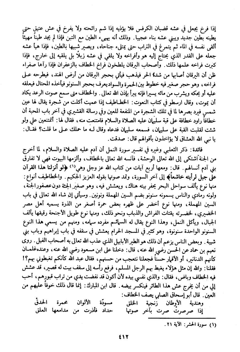 ذكر الثعلبي وغيره في تفسير سورة النمل أن آدم عليه الصلاة والسلام، لما أخرج من الجنة اشتكى إلى الله تعالى الوحشة، فآنسه الله تعالى بالخطاف، وألزمها البيوت فهي لا تفارق بني آدم أنسالهم. قال: ومعها أربع آيات من كتاب الله عز وجل وهي «1» لَوْ أَنْزَلْنا هذَا الْقُرْآنَ عَلى جَبَلٍ لَرَأَيْتَهُ خاشِعاً