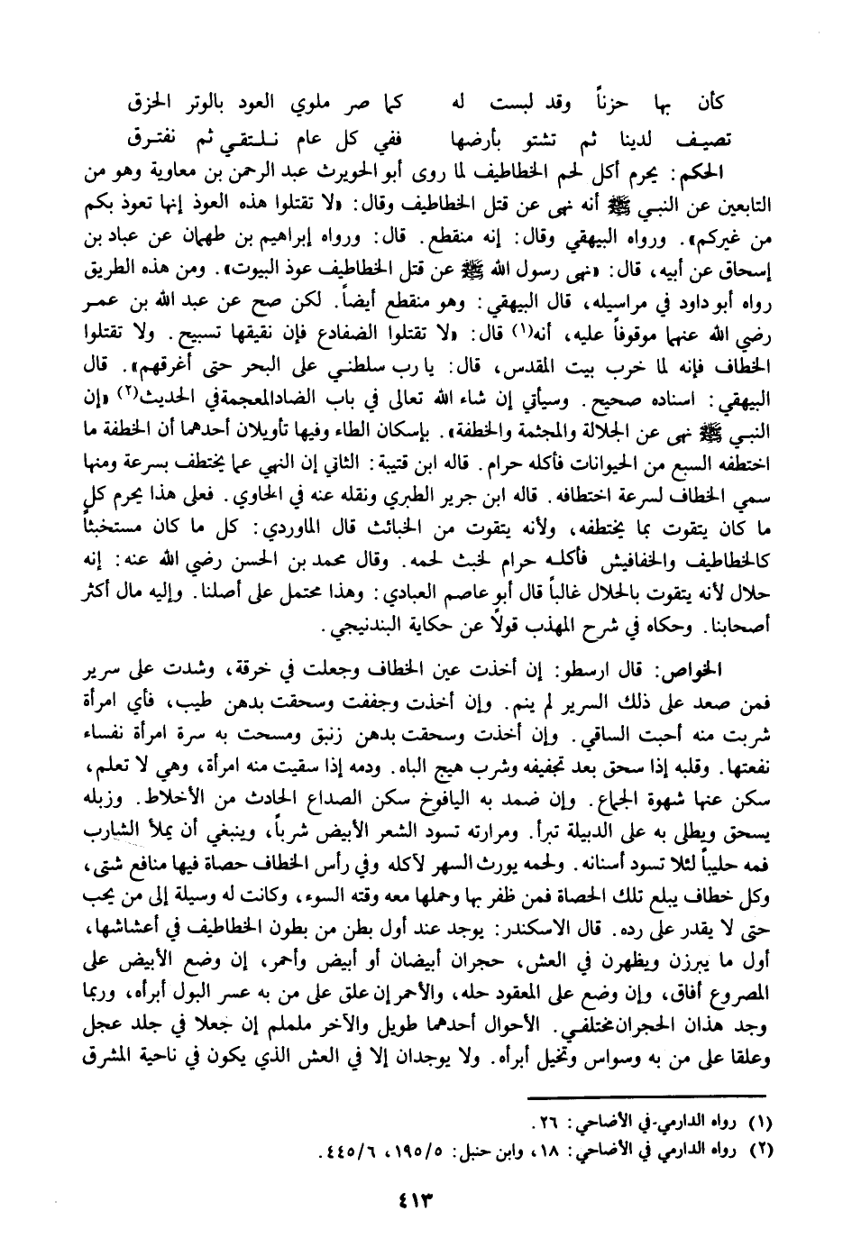 يحرم أكل لحم الخطاطيف لما روى أبو الحويرث عبد الرحمن بن معاوية وهو من التابعين عن النبي صلى الله عليه وسلم أنه نهى عن قتل الخطاطيف وقال: «لا تقتلوا هذه العوذ إنها تعوذ بكم من غيركم» . ورواه البيهقي وقال: إنه منقطع. قال: ورواه إبراهيم بن طهمان عن عباد بن إسحاق عن أبيه، قال: «نهى رسول الله صلى الله عليه وسلم عن قتل الخطاطيف عوذ البيوت» . ومن هذه الطريق رواه أبو داود في مراسيله، قال البيهقي: وهو منقطع أيضا. لكن صح عن عبد الله بن عمر رضي الله عنهما موقوفا عليه، أنه «1» قال: «لا تقتلوا الضفادع فإن نقيقها تسبيح. ولا تقتلوا الخطاف فإنه لما خرب بيت المقدس، قال: يا رب سلطني على البحر حتى أغرقهم» . قال البيهقي: اسناده صحيح. وسيأتي إن شاء الله تعالى في باب الضاد المعجمة في الحديث «2» «إن النبي صلى الله عليه وسلم نهى عن الجلالة والمجثمة والخطفة» . بإسكان الطاء وفيها تأويلان أحدهما أن الخطفة ما اختطفه السبع من الحيوانات فأكله حرام. قاله ابن قتيبة: الثاني إن النهي عما يختطف بسرعة ومنها سمي الخطاف لسرعة اختطافه. قاله ابن جرير الطبري ونقله عنه في الحاوي. فعلى هذا يحرم كل ما كان يتقوت بما يختطفه، ولأنه يتقوت من الخبائث قال الماوردي: كل ما كان مستخبثا كالخطاطيف والخفافيش فأكله حرام لخبث لحمه. وقال محمد بن الحسن رضي الله عنه: إنه حلال لأنه يتقوت بالحلال غالبا قال أبو عاصم العبادي: وهذا محتمل على أصلنا. وإليه مال أكثر أصحابنا. وحكاه في شرح المهذب قولا عن حكاية البندنيجي.