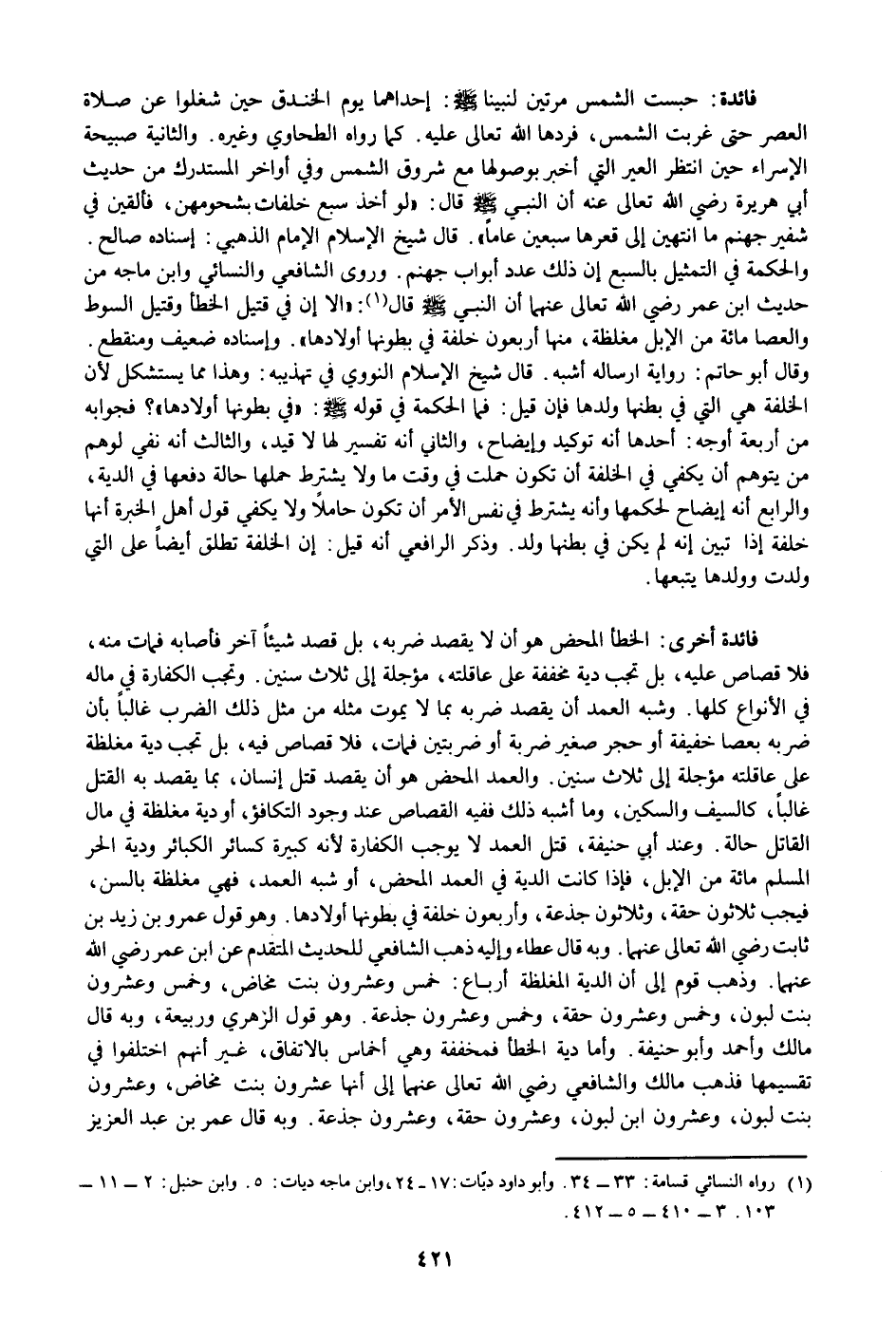 الخطأ المحض هو أن لا يقصد ضربه، بل قصد شيئا آخر فأصابه فمات منه، فلا قصاص عليه، بل تجب دية مخففة على عاقلته، مؤجلة إلى ثلاث سنين. وتجب الكفارة في ماله في الأنواع كلها. وشبه العمد أن يقصد ضربه بما لا يموت مثله من مثل ذلك الضرب غالبا بأن ضربه بعصا خفيفة أو حجر صغير ضربة أو ضربتين فمات، فلا قصاص فيه، بل تجب دية مغلظة على عاقلته مؤجلة إلى ثلاث سنين. والعمد المحض هو أن يقصد قتل إنسان، بما يقصد به القتل غالبا، كالسيف والسكين، وما أشبه ذلك ففيه القصاص عند وجود التكافؤ، أو دية مغلظة في مال القاتل حالة. وعند أبي حنيفة، قتل العمد لا يوجب الكفارة لأنه كبيرة كسائر الكبائر ودية الحر المسلم مائة من الإبل، فإذا كانت الدية في العمد المحض، أو شبه العمد، فهي مغلظة بالسن، فيجب ثلاثون حقة، وثلاثون جذعة، وأربعون خلفة في بطونها أولادها. وهو قول عمرو بن زيد بن ثابت رضي الله تعالى عنهما. وبه قال عطاء وإليه ذهب الشافعي للحديث المتقدم عن ابن عمر رضي الله عنهما. وذهب قوم إلى أن الدية المغلظة أرباع: خمس وعشرون بنت مخاض، وخمس وعشرون بنت لبون، وخمس وعشرون حقة، وخمس وعشرون جذعة. وهو قول الزهري وربيعة، وبه قال مالك وأحمد وأبو حنيفة. وأما دية الخطأ فمخففة وهي أخماس بالاتفاق، غير أنهم اختلفوا في تقسيمها فذهب مالك والشافعي رضي الله تعالى عنهما إلى أنها عشرون بنت مخاض، وعشرون بنت لبون، وعشرون ابن لبون، وعشرون حقة، وعشرون جذعة. وبه قال عمر بن عبد العزيز
