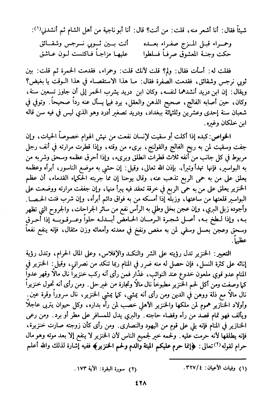 وأولاد الخنازير هموم لمن ملكها والخنزير الأهلي خصب لمن رأه بداره، وكل حيوان يتربى عاجلا ويألف فهو تمام قصد من رآه وقضاء حاجته. والبري يدل للمسافر على مطر أو برد. ومن رعى الخنازير في المنام فإنه يلي على قوم من اليهود والنصارى. ومن رأى كأن زوجته صارت خنزيرة، فإنه يطلقها لأنه حرمت عليه. ولحمه خير لجميع الناس لأن الخنزير لا ينفع إلا بعد موته وهو مال حرام لقوله «2» تعالى: إِنَّما حَرَّمَ عَلَيْكُمُ الْمَيْتَةَ وَالدَّمَ وَلَحْمَ الْخِنْزِيرِ*