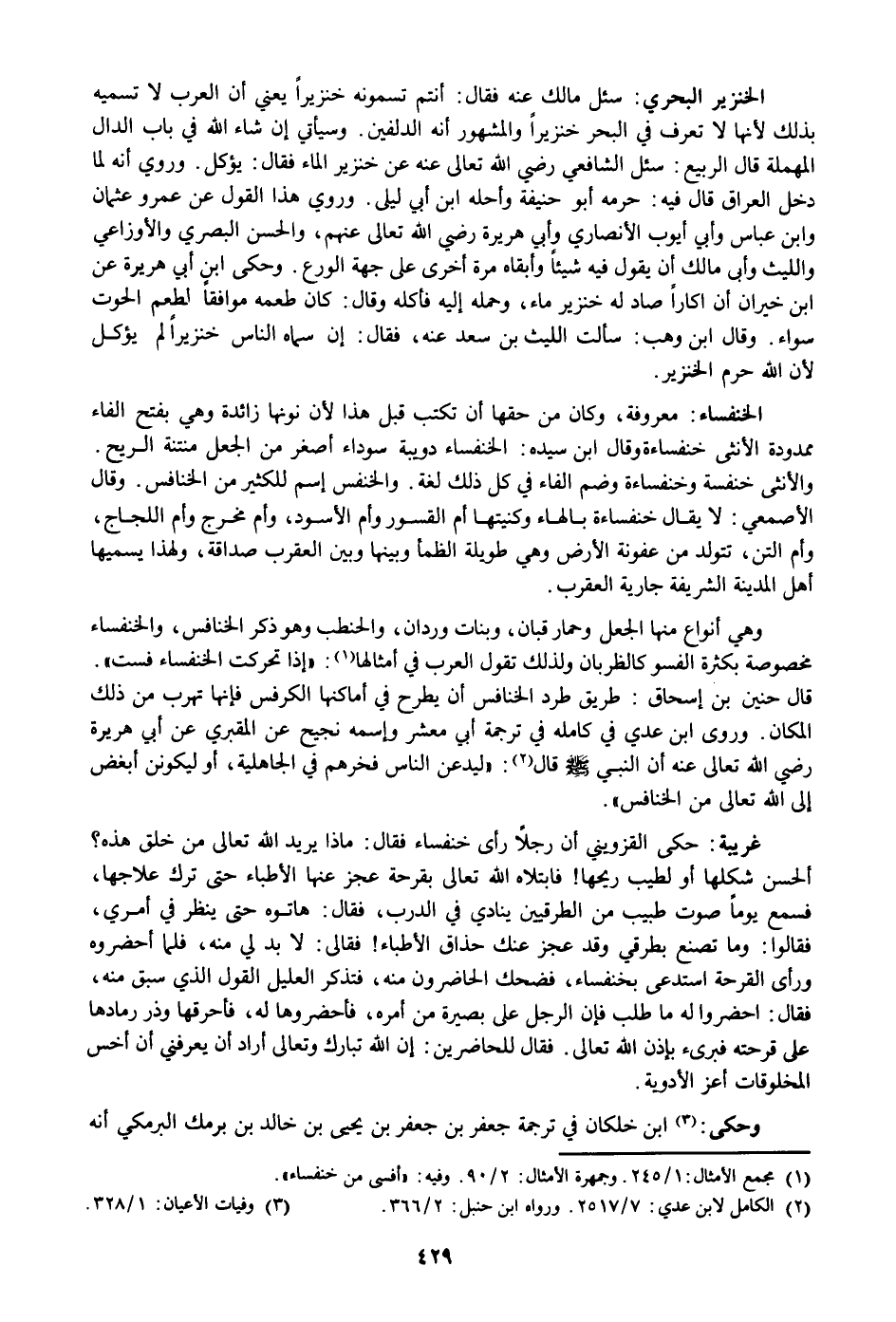 قال حنين بن إسحاق: طريق طرد الخنافس أن يطرح في أماكنها الكرفس فإنها تهرب من ذلك المكان. وروى ابن عدي في كامله في ترجمة أبي معشر وإسمه نجيح عن المقبري عن أبي هريرة رضي الله تعالى عنه أن النبي صلى الله عليه وسلم قال «2» : «ليدعن الناس فخرهم في الجاهلية، أو ليكونن أبغض إلى الله تعالى من الخنافس» .