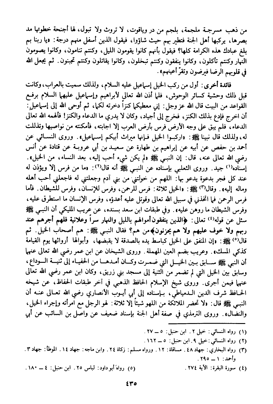 إسناده «1» جيد. وروى الثعلبي بإسناده عن النبي صلى الله عليه وسلم أنه قال «2» : «ما من فرس إلا ويؤذن له عند كل فجر بدعوة يدعو بها: اللهم من خولتني من بني آدم وجعلتني له فاجعلني أحب أهله وماله إليه» . وقال «3» صلى الله عليه وسلم: «الخيل ثلاثة: فرس للرحمن، وفرس للإنسان، وفرس للشيطان. فأما فرس الرحمن فما اتخذني في سبيل الله تعالى وقوتل عليه أعدؤه، وفرس الإنسان ما استطرق عليه، وفرس الشيطان ما روهن عليه» . وفي طبقات ابن سعد بسنده، عن عريب المليكي أن النبي صلى الله عليه وسلم سئل عن قوله «4» تعالى: الَّذِينَ يُنْفِقُونَ أَمْوالَهُمْ بِاللَّيْلِ وَالنَّهارِ سِرًّا وَعَلانِيَةً فَلَهُمْ أَجْرُهُمْ عِنْدَ رَبِّهِمْ وَلا خَوْفٌ عَلَيْهِمْ وَلا هُمْ يَحْزَنُونَ
