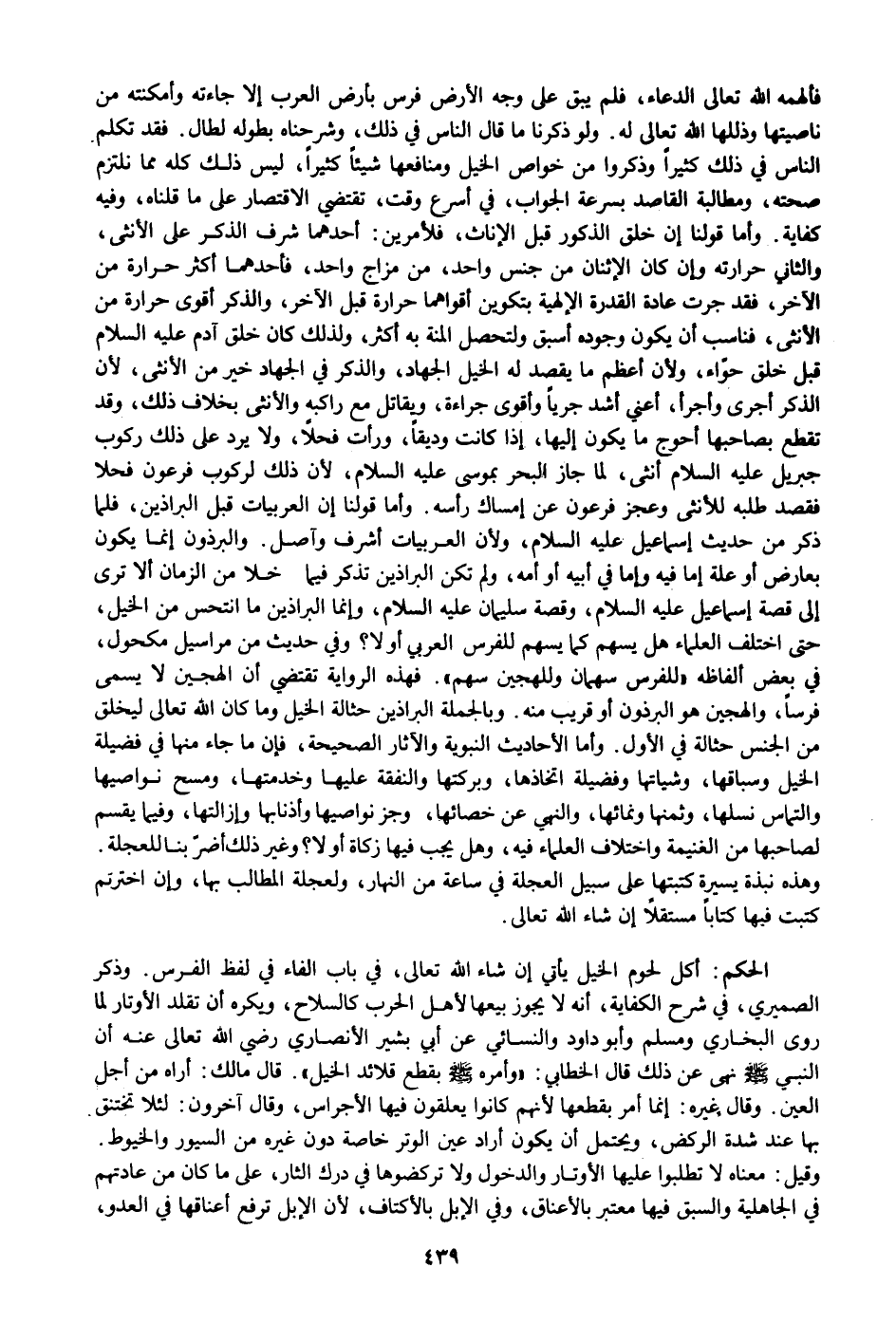 فألهمه الله تعالى الدعاء، فلم يبق على وجه الأرض فرس بأرض العرب إلا جاءته وأمكنته من ناصيتها وذللها الله تعالى له. ولو ذكرنا ما قال الناس في ذلك، وشرحناه بطوله لطال. فقد تكلم الناس في ذلك كثيرا وذكروا من خواص الخيل ومنافعها شيئا كثيرا، ليس ذلك كله مما نلتزم صحته، ومطالبة القاصد بسرعة الجواب، في أسرع وقت، تقتضي الاقتصار على ما قلناه، وفيه كفاية. وأما قولنا إن خلق الذكور قبل الإناث، فلأمرين: أحدهما شرف الذكر على الأنثى، والثاني حرارته وإن كان الإثنان من جنس واحد، من مزاج واحد، فأحدهما أكثر حرارة من الآخر، فقد جرت عادة القدرة الإلهية بتكوين أقواهما حرارة قبل الآخر، والذكر أقوى حرارة من الأنثى، فناسب أن يكون وجوده أسبق ولتحصل المنة به أكثر، ولذلك كان خلق آدم عليه السلام قبل خلق حوّاء، ولأن أعظم ما يقصد له الخيل الجهاد، والذكر في الجهاد خير من الأنثى، لأن الذكر أجرى وأجرأ، أعني أشد جريا وأقوى جراءة، ويقاتل مع راكبه والأنثى بخلاف ذلك، وقد تقطع بصاحبها أحوج ما يكون إليها، إذا كانت وديقا، ورأت فحلا، ولا يرد على ذلك ركوب جبريل عليه السلام أنثى، لما جاز البحر بموسى عليه السلام، لأن ذلك لركوب فرعون فحلا فقصد طلبه للأنثى وعجز فرعون عن إمساك رأسه. وأما قولنا إن العربيات قبل البراذين، فلما ذكر من حديث إسماعيل عليه السلام، ولأن العربيات أشرف وآصل. والبرذون إنما يكون بعارض أو علة إما فيه وإما في أبيه أو أمه، ولم تكن البراذين تذكر فيما خلا من الزمان ألا ترى إلى قصة إسماعيل عليه السلام، وقصة سليمان عليه السلام، وإنما البراذين ما انتحس من الخيل، حتى اختلف العلماء هل يسهم كما يسهم للفرس العربي أو لا؟ وفي حديث من مراسيل مكحول، في بعض ألفاظه «للفرس سهمان وللهجين سهم» . فهذه الرواية تقتضي أن الهجين لا يسمى فرسا، والهجين هو البرذون أو قريب منه. وبالجملة البراذين حثالة الخيل وما كان الله تعالى ليخلق من الجنس حثالة في الأول. وأما الأحاديث النبوية والآثار الصحيحة، فإن ما جاء منها في فضيلة الخيل وسباقها، وشياتها وفضيلة اتخاذها، وبركتها والنفقة عليها وخدمتها، ومسح نواصيها والتماس نسلها، وثمنها ونمائها، والنهي عن خصائها، وجز نواصيها وأذنابها وإزالتها، وفيما يقسم لصاحبها من الغنيمة واختلاف العلماء فيه، وهل يجب فيها زكاة أو لا؟ وغير ذلك أضرّ بنا للعجلة.