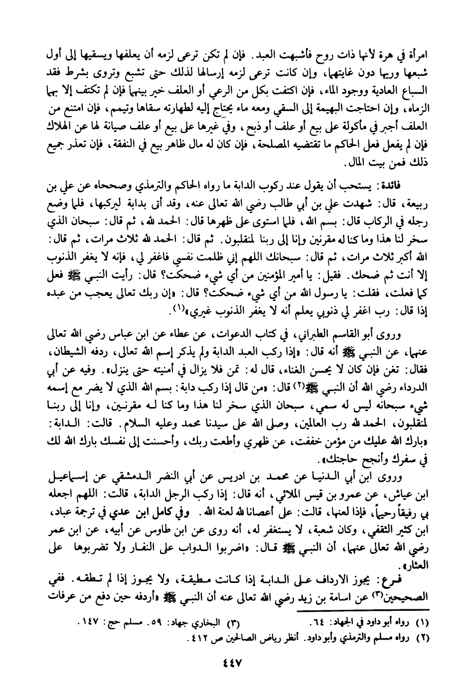 وروى ابن أبي الدنيا عن محمد بن ادريس عن أبي النضر الدمشقي عن إسماعيل ابن عياش، عن عمرو بن قيس الملائي، أنه قال: إذا ركب الرجل الدابة، قالت: اللهم اجعله بي رفيقا رحيما، فإذا لعنها، قالت: على أعصانا لله لعنة الله. وفي كامل ابن عدي في ترجمة عباد، ابن كثير الثقفي، وكان شعبة، لا يستغفر له، أنه روى عن ابن طاوس عن أبيه، عن ابن عمر رضي الله تعالى عنهما، أن النبي صلى الله عليه وسلم قال: «اضربوا الدواب على النفار ولا تضربوها على العثار» .