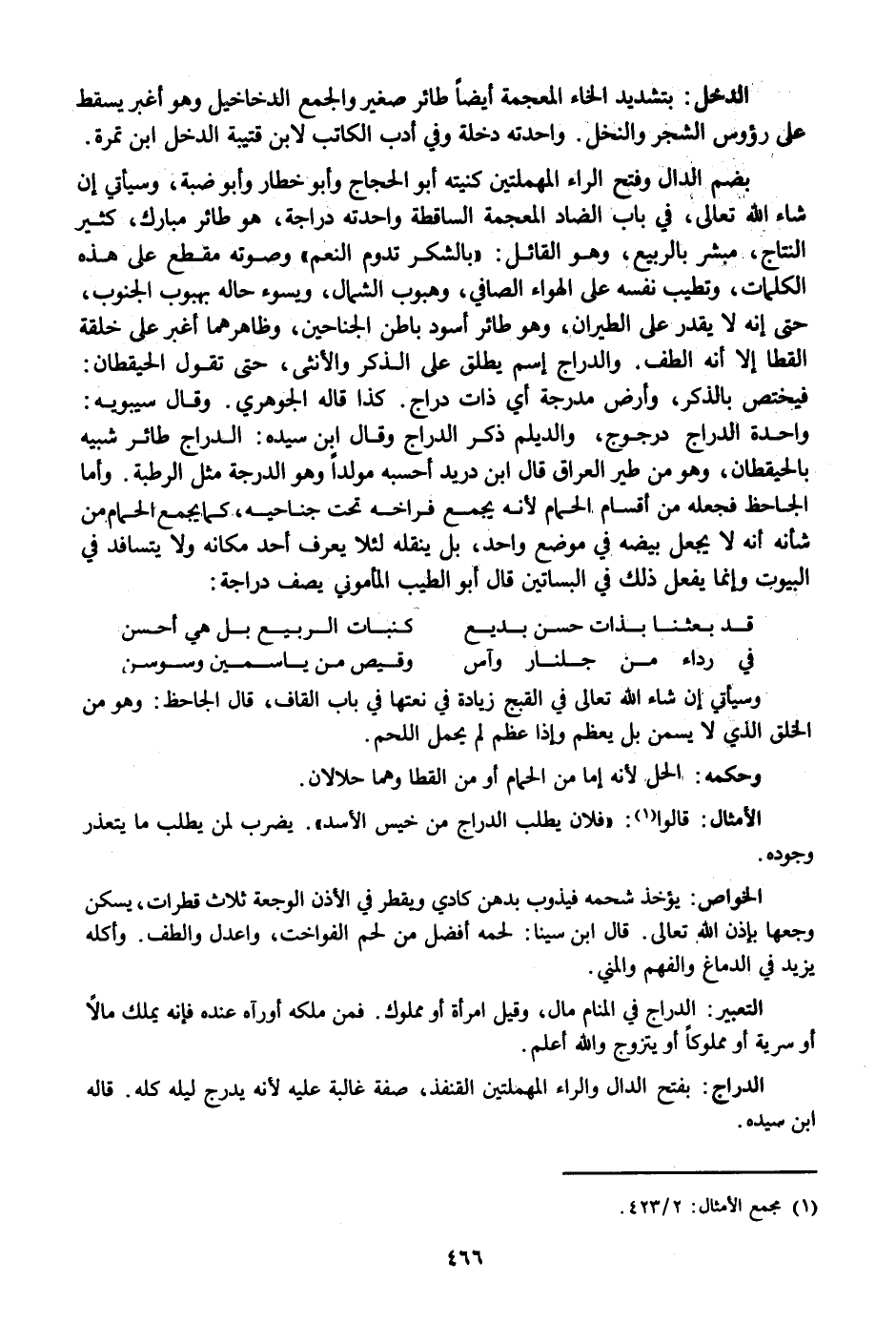 بضم الدال وفتح الراء المهملتين كنيته أبو الحجاج وأبو خطار وأبو ضبة، وسيأتي إن شاء الله تعالى، في باب الضاد المعجمة الساقطة واحدته دراجة، هو طائر مبارك، كثير النتاج، مبشر بالربيع، وهو القائل: «بالشكر تدوم النعم» وصوته مقطع على هذه الكلمات، وتطيب نفسه على الهواء الصافي، وهبوب الشمال، ويسوء حاله بهبوب الجنوب، حتى إنه لا يقدر على الطيران، وهو طائر أسود باطن الجناحين، وظاهرهما أغبر على خلقة القطا إلا أنه الطف. والدراج إسم يطلق على الذكر والأنثى، حتى تقول الحيقطان: