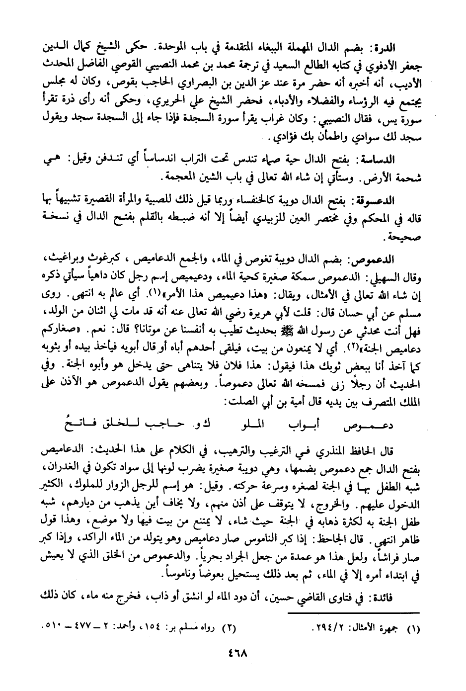 بضم الدال دويبة تغوص في الماء، والجمع الدعاميص، كبرغوث وبراغيث، وقال السهيلي: الدعموص سمكة صغيرة كحية الماء، ودعيميص إسم رجل كان داهيا سيأتي ذكره إن شاء الله تعالى في الأمثال، ويقال: «هذا دعيميص هذا الأمر» «1» . أي عالم به انتهى. روى مسلم عن أبي حسان قال: قلت لأبي هريرة رضي الله تعالى عنه أنه قد مات لي اثنان من الولد، فهل أنت محدثي عن رسول الله صلى الله عليه وسلم بحديث تطيب به أنفسنا عن موتانا؟ قال: نعم. «صغاركم دعاميص الجنة» «2» . أي لا يمنعون من بيت، فيلقى أحدهم أباه أو قال أبويه فيأخذ بيده أو بثوبه كما آخذ أنا ببعض ثوبك هذا فيقول: هذا فلان فلا يتناهى حتى يدخل هو وأبوه الجنة. وفي الحديث أن رجلا زنى فمسخه الله تعالى دعموصا. وبعضهم يقول الدعموص هو الآذن على الملك المتصرف بين يديه قال أمية بن أبي الصلت: