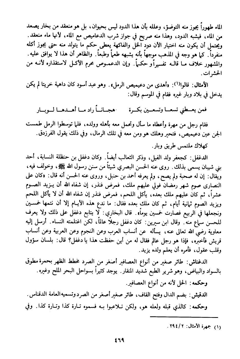الماء طهورا يجوز منه التوضؤ، وعلله بأن هذا الدود ليس بحيوان، بل هو منعقد من بخار يصعد من الماء، فيشبه الدود، وهذا منه صريح في جواز شرب الدعاميص مع الماء، لأنها ماء منعقد.