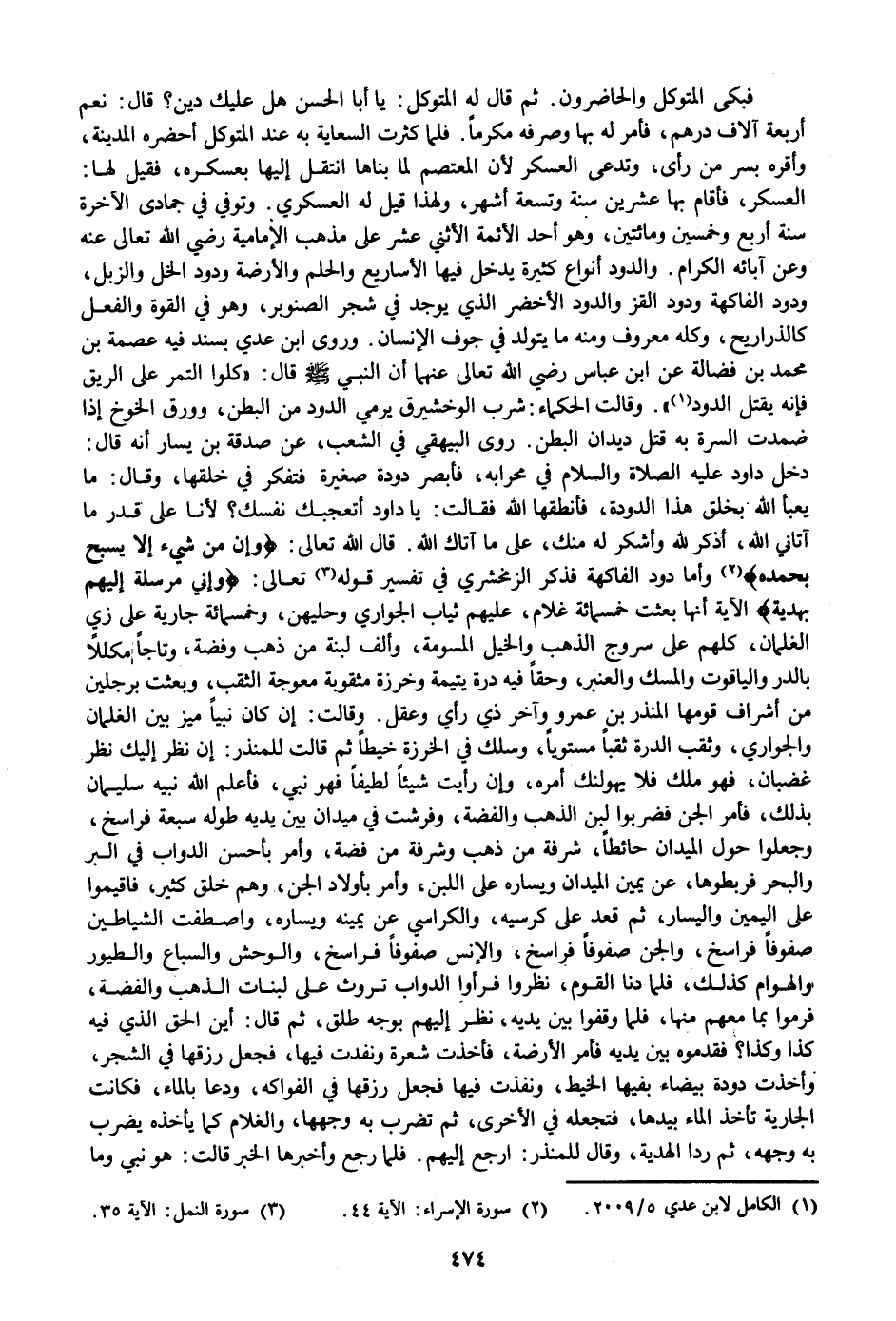 العسكر، فأقام بها عشرين سنة وتسعة أشهر، ولهذا قيل له العسكري. وتوفي في جمادى الآخرة سنة أربع وخمسين ومائتين، وهو أحد الأئمة الأثني عشر على مذهب الإمامية رضي الله تعالى عنه وعن آبائه الكرام. والدود أنواع كثيرة يدخل فيها الأساريع والحلم والأرضة ودود الخل والزبل، ودود الفاكهة ودود القز والدود الأخضر الذي يوجد في شجر الصنوبر، وهو في القوة والفعل كالذراريح، وكله معروف ومنه ما يتولد في جوف الإنسان. وروى ابن عدي بسند فيه عصمة بن محمد بن فضالة عن ابن عباس رضي الله تعالى عنهما أن النبي صلى الله عليه وسلم قال: «كلوا التمر على الريق فإنه يقتل الدود «1» » . وقالت الحكماء: شرب الوخشيرق يرمي الدود من البطن، وورق الخوخ إذا ضمدت السرة به قتل ديدان البطن. روى البيهقي في الشعب، عن صدقة بن يسار أنه قال:
