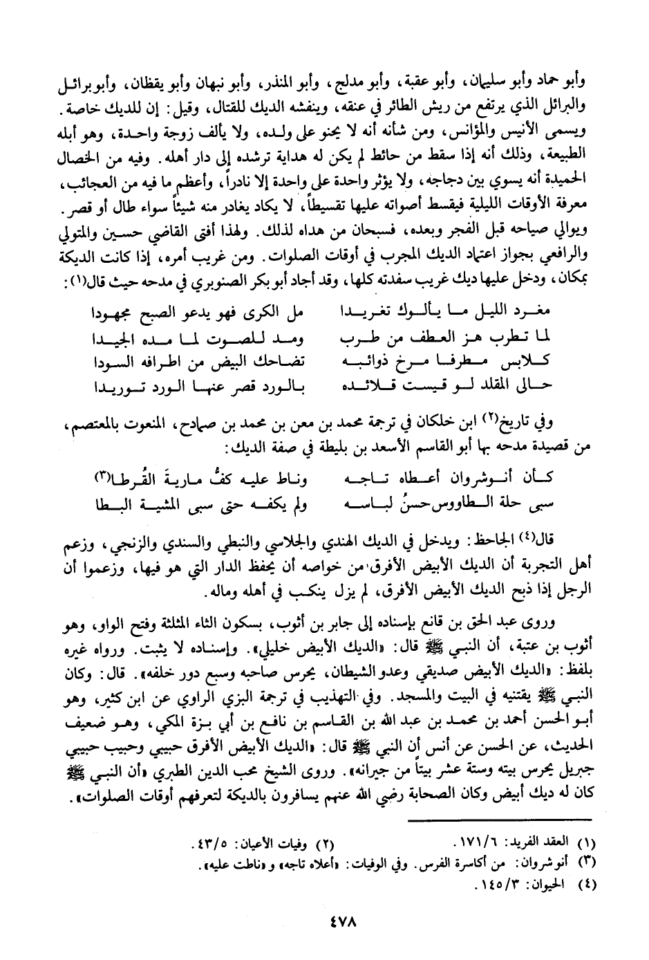 ويوالي صياحه قبل الفجر وبعده، فسبحان من هداه لذلك. ولهذا أفتى القاضي حسين والمتولي والرافعي بجواز اعتماد الديك المجرب في أوقات الصلوات. ومن غريب أمره، إذا كانت الديكة بمكان، ودخل عليها ديك غريب سفدته كلها، وقد أجاد أبو بكر الصنوبري في مدحه حيث قال «1» :