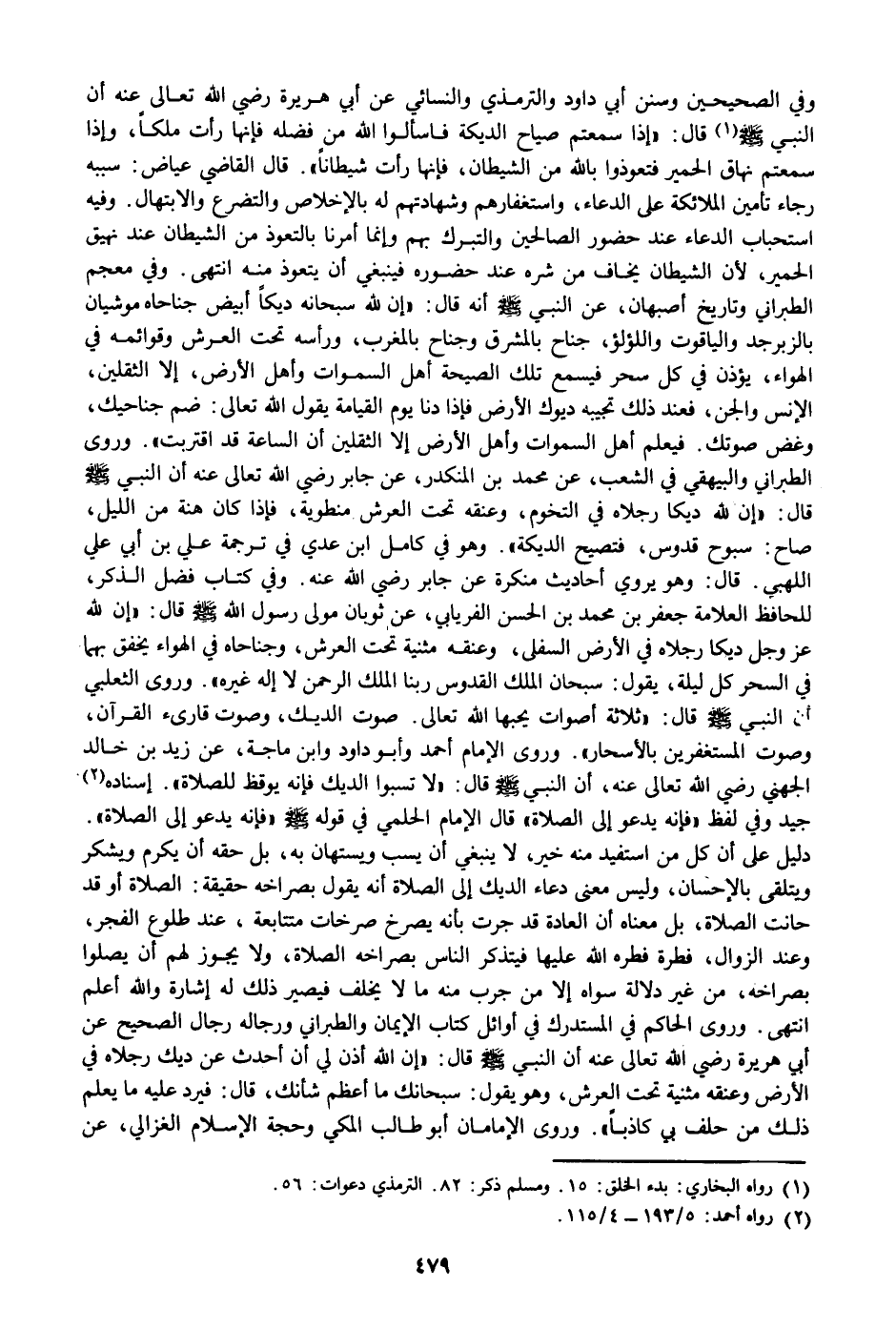 وفي الصحيحين وسنن أبي داود والترمذي والنسائي عن أبي هريرة رضي الله تعالى عنه أن النبي صلى الله عليه وسلم «1» قال: «إذا سمعتم صياح الديكة فاسألوا الله من فضله فإنها رأت ملكا، وإذا سمعتم نهاق الحمير فتعوذوا بالله من الشيطان، فإنها رأت شيطانا» . قال القاضي عياض: سببه رجاء تأمين الملائكة على الدعاء، واستغفارهم وشهادتهم له بالإخلاص والتضرع والابتهال. وفيه استحباب الدعاء عند حضور الصالحين والتبرك بهم وإنما أمرنا بالتعوذ من الشيطان عند نهيق الحمير، لأن الشيطان يخاف من شره عند حضوره فينبغي أن يتعوذ منه انتهى. وفي معجم الطبراني وتاريخ أصبهان، عن النبي صلى الله عليه وسلم أنه قال: «إن لله سبحانه ديكا أبيض جناحاه موشيان بالزبرجد والياقوت واللؤلؤ، جناح بالمشرق وجناح بالمغرب، ورأسه تحت العرش وقوائمه في الهواء، يؤذن في كل سحر فيسمع تلك الصيحة أهل السموات وأهل الأرض، إلا الثقلين، الإنس والجن، فعند ذلك تجيبه ديوك الأرض فإذا دنا يوم القيامة يقول الله تعالى: ضم جناحيك، وغض صوتك. فيعلم أهل السموات وأهل الأرض إلا الثقلين أن الساعة قد اقتربت» . وروى الطبراني والبيهقي في الشعب، عن محمد بن المنكدر، عن جابر رضي الله تعالى عنه أن النبي صلى الله عليه وسلم قال: «إن لله ديكا رجلاه في التخوم، وعنقه تحت العرش منطوية، فإذا كان هنة من الليل، صاح: سبوح قدوس، فتصيح الديكة» . وهو في كامل ابن عدي في ترجمة علي بن أبي علي اللهبي. قال: وهو يروي أحاديث منكرة عن جابر رضي الله عنه. وفي كتاب فضل الذكر، للحافظ العلامة جعفر بن محمد بن الحسن الفريابي، عن ثوبان مولى رسول الله صلى الله عليه وسلم قال: «إن لله عز وجل ديكا رجلاه في الأرض السفلى، وعنقه مثنية تحت العرش، وجناحاه في الهواء يخفق بهما في السحر كل ليلة، يقول: سبحان الملك القدوس ربنا الملك الرحمن لا إله غيره» . وروى الثعلبي أن النبي صلى الله عليه وسلم قال: «ثلاثة أصوات يحبها الله تعالى. صوت الديك، وصوت قارىء القرآن، وصوت المستغفرين بالأسحار» . وروى الإمام أحمد وأبو داود وابن ماجة، عن زيد بن خالد الجهني رضي الله تعالى عنه، أن النبي صلى الله عليه وسلم قال: «لا تسبوا الديك فإنه يوقظ للصلاة» . إسناده «2» جيد وفي لفظ «فإنه يدعو إلى الصلاة» قال الإمام الحلمي في قوله صلى الله عليه وسلم «فإنه يدعو إلى الصلاة» .