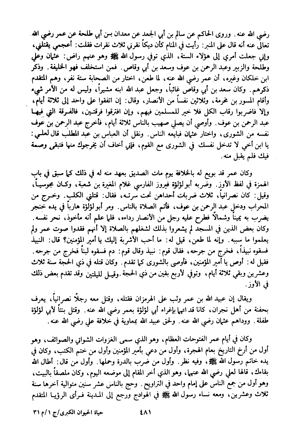 رضي الله عنه. وروى الحاكم عن سالم بن أبي الجعد عن معدان بن أبي طلحة عن عمر رضي الله تعالى عنه أنه قال على المنبر: رأيت في المنام كأن ديكا نقرني ثلاث نقرات فقلت: أعجمي يقتلني، وإني جعلت أمري إلى هؤلاء الستة، الذي توفي رسول الله صلى الله عليه وسلم وهو عنهم راض: عثمان وعلي وطلحة والزبير وعبد الرحمن بن عوف وسعد بن أبي وقاص. فمن استخلف فهو الخليفة. وذكر ابن خلكان وغيره، أن عمر رضي الله عنه، لما طعن، اختار من الصحابة ستة نفر، وهم المتقدم ذكرهم. وكان سعد بن أبي وقاص غائبا، وجعل عبد الله ابنه مشيرا، وليس له من الأمر شيء وأقام المسور بن مخرمة، وثلاثين نفسا من الأنصار، وقال: إن اتفقوا على واحد إلى ثلاثة أيام، وإلا فاضربوا رقاب الكل فلا خير للمسلمين فيهم، وإن افترقوا فرقتين، فالفرقة التي فيها عبد الرحمن بن عوف. وأوصي أن يصلي صهيب بالناس ثلاثة أيام، فأخرج عبد الرحمن بن عوف نفسه من الشورى، واختار عثمان فبايعه الناس. ونقل أن العباس بن عبد المطلب قال لعلي: