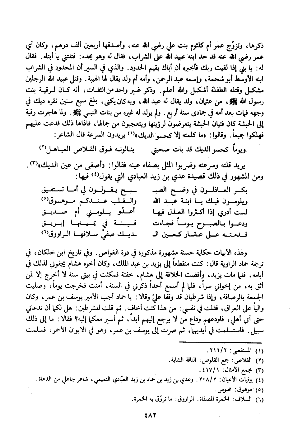 ذكرها، وتزوّج عمر أم كلثوم بنت علي رضي الله عنه، وأصدقها أربعين ألف درهم، وكان أي عمر رضي الله عنه قد حد ابنه عبيد الله على الشراب، فقال له وهو يحده: قتلتني يا أبتاه. فقال له: يا بني إذا لقيت ربك فأخبره أن أباك يقيم الحدود. والذي في السير أن المحدود في الشراب ابنه الأوسط أبو شحمة، وإسمه عبد الرحمن، وأمه أم ولد يقال لها الهيبة. وقتل عبيد الله الرجلين مشكل وقتله الطفلة أشكل والله أعلم. وذكر غير واحد من الثقات، أنه كان لرقية بنت رسول الله صلى الله عليه وسلم، من عثمان، ولد يقال له عبد الله، وبه كان يكنى، بلغ سبع سنين نقره ديك في وجهه فمات بعد أمه في جمادى سنة أربع. ولم يولد له غيره من بنات النبي صلى الله عليه وسلم. ولما هاجرت رقية إلى الحبشة كان فتيان الحبشة يتعرضون لرؤيتها ويتعجبون من جمالها، فآذاها ذلك فدعت عليهم فهلكوا جميعا. وقالوا: «ما كلمته إلا كحسو الديك» «1» يريدون السرعة قال الشاعر: