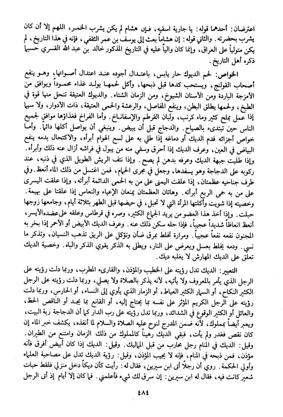 وإذا طليت جبهة الديك وعرفه بدهن لم يصح. وإذا نتف الريش الطويل الذي في ذنبه، عند ركوبه على الدجاجة وهو يسفدها، وجعل في مجرى الحمام، فمن اغتسل من ذلك الماء أنعظ. وفي طرف جناحيه عظمتان، إذا علقت اليمنى على من به الحمى الدائمة أبرأته، وإذا علقت اليسرى على من به حمى الربع أبرأته. وهاتان العظمتان يمنعان الإعياء والنعاس إذا علقتا على بهيمة.