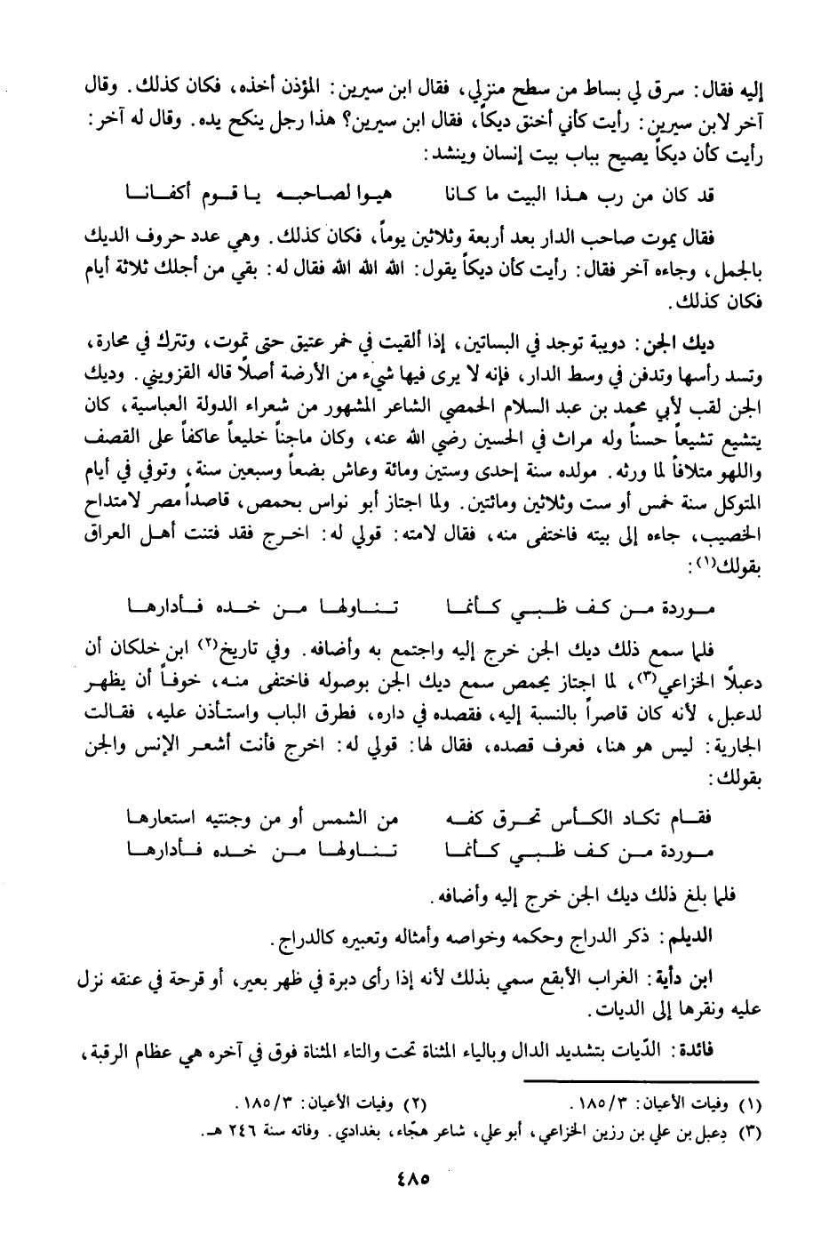 فلما سمع ذلك ديك الجن خرج إليه واجتمع به وأضافه. وفي تاريخ «2» ابن خلكان أن دعبلا الخزاعي «3» ، لما اجتاز يحمص سمع ديك الجن بوصوله فاختفى منه، خوفا أن يظهر لدعبل، لأنه كان قاصرا بالنسبة إليه، فقصده في داره، فطرق الباب واستأذن عليه، فقالت الجارية: ليس هو هنا، فعرف قصده، فقال لها: قولي له: اخرج فأنت أشعر الإنس والجن بقولك: