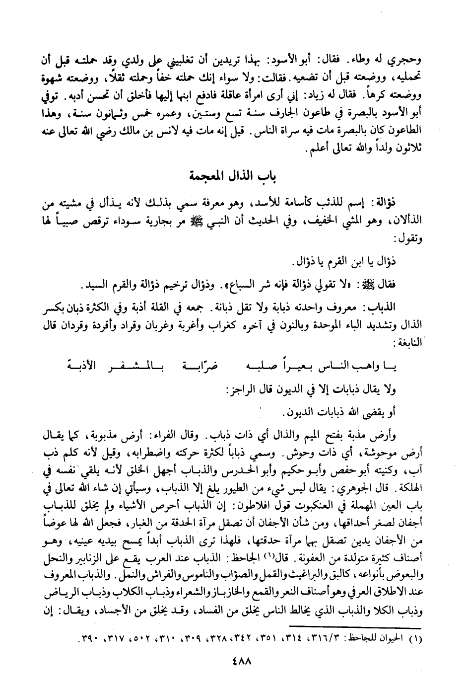 وأرض مذبة بفتح الميم والذال أي ذات ذباب. وقال الفراء: أرض مذبوبة، كما يقال أرض موحوشة، أي ذات وحوش. وسمي ذبابا لكثرة حركته واضطرابه، وقيل لأنه كلم ذب آب، وكنيته أبو حفص وأبو حكيم وأبو الحدرس والذباب أجهل الخلق لأنه يلقي نفسه في الهلكة. قال الجوهري: يقال ليس شيء من الطيور يلغ إلا الذباب، وسيأتي إن شاء الله تعالى في باب العين المهملة في العنكبوت قول افلاطون: إن الذباب أحرص الأشياء ولم يخلق للذباب أجفان لصغر أحداقها، ومن شأن الأجفان أن تصقل مرآة الحدقة من الغبار، فجعل الله لها عوضا من الأجفان يدين تصقل بهما مرآة حدقتها، فلهذا ترى الذباب أبدا يمسح بيديه عينيه، وهو أصناف كثيرة متولدة من العفونة. قال «1» الجاحظ: الذباب عند العرب يقع على الزنابير والنحل والبعوض بأنواعه، كالبق والبراغيث والقمل والصؤاب والناموس والفراش والنمل. والذباب المعروف عند الاطلاق العرفي وهو أصناف النعر والقمع والخازباز والشعراء وذباب الكلاب وذباب الرياض وذباب الكلا والذباب الذي يخالط الناس يخلق من الفساد، وقد يخلق من الأجساد، ويقال: إن