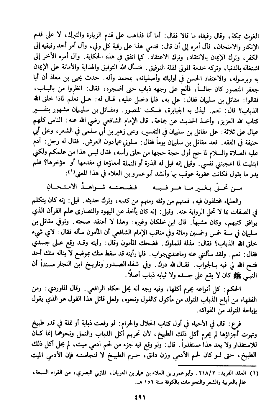 الغوث بمكة، وقال رفيقاه ما قالا فقال: أما أنا فذاهب على قدم الزيارة والتبرك، لا على قدم الإنكار والامتحان، فآل أمره إلى أن قال: قدمي هذا على رقبة كل ولي، وآل أمر أحد رفيقيه إلى الكفر، وترك الإيمان بالانتقاد، وترك الاعتقاد. كما اتفق في هذه الحكاية. وآل أمره الآخر إلى اشتغاله بالدنيا، وتركه خدمة المولى لقلة التوفيق. فنسأل الله التوفيق والهداية والأمانة على الإيمان به وبرسوله، والاعتقاد الحسن في أوليائه وأصفيائه، بمحمد وآله. حدث يحيى بن معاذ أن أبا جعفر المنصور كان جالسا، فألح على وجهه ذباب حتى أضجره، فقال: انظروا من بالباب، فقالوا: مقاتل بن سليمان فقال: علي به، فلما دخل عليه، قال له: هل تعلم لماذا خلق الله الذباب؟ قال: نعم. ليذل به الجبابرة، فسكت المنصور. ومقاتل بن سليمان مشهور بتفسير كتاب الله العزيز، وأخذ الحديث عن جماعة، قال الإمام الشافعي رضي الله عنه: الناس كلهم عيال على ثلاثة: على مقاتل بن سليمان في التفسير، وعلى زهير بن أبي سلمى في الشعر، وعلى أبي حنيفة في الفقه. قعد مقاتل بن سليمان يوما فقال: سلوني عما دون العرش. فقال له رجل: آدم عليه الصلاة والسلام لما حج أول حجة حجها من حلق رأسه، فقال ليس هذا من علمكم ولكني ابتليت لما اعجبتني نفسي. وقيل إنه قيل له الذرة أو النملة أمعاؤها في مقدمها أو مؤخرها؟ فلم يدر ما يقول فكانت عقوبة عوقب بها وأنشد أبو عمرو بن العلاء في هذا المعنى «1» :