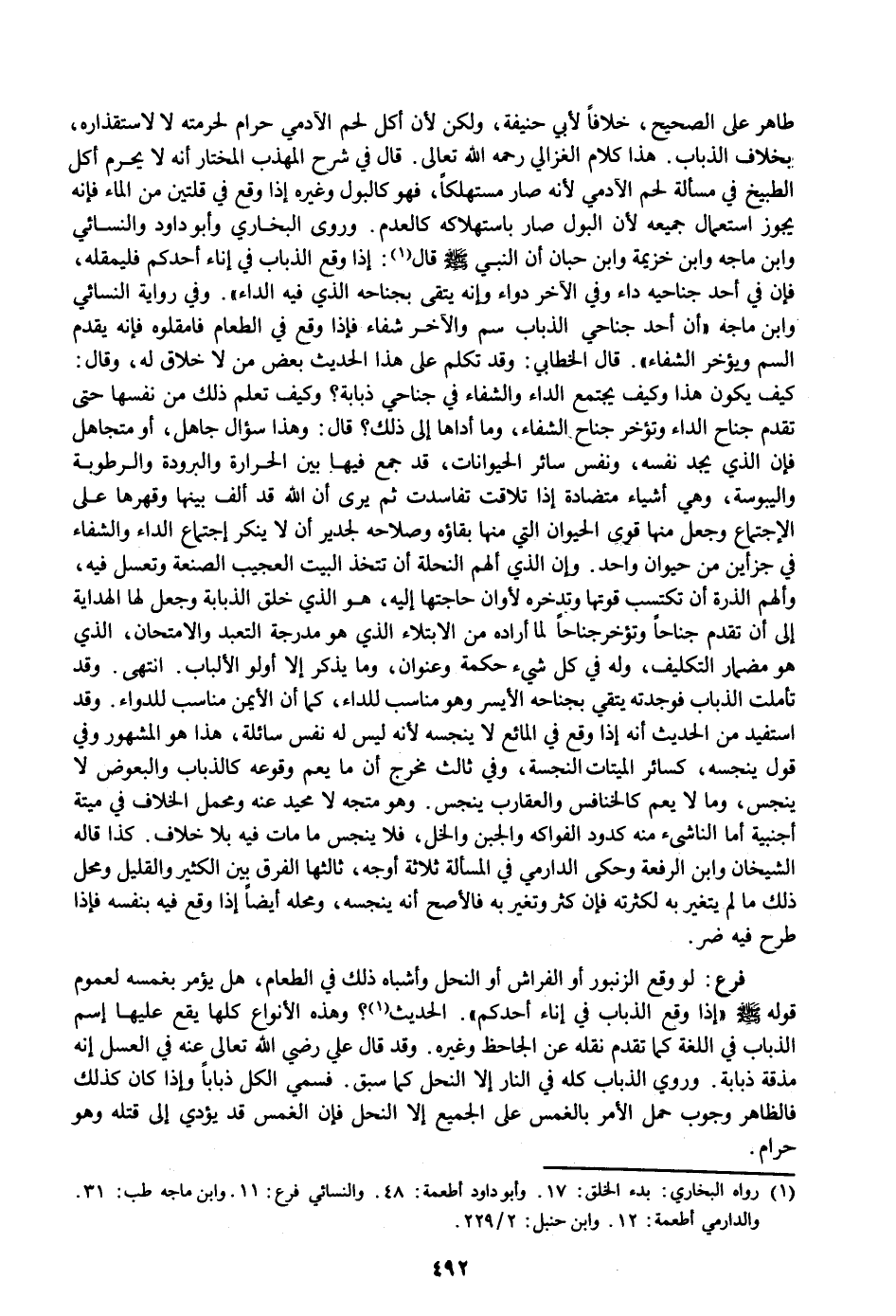 كيف يكون هذا وكيف يجتمع الداء والشفاء في جناحي ذبابة؟ وكيف تعلم ذلك من نفسها حتى تقدم جناح الداء وتؤخر جناح الشفاء، وما أداها إلى ذلك؟ قال: وهذا سؤال جاهل، أو متجاهل فإن الذي يجد نفسه، ونفس سائر الحيوانات، قد جمع فيها بين الحرارة والبرودة والرطوبة واليبوسة، وهي أشياء متضادة إذا تلاقت تفاسدت ثم يرى أن الله قد ألف بينها وقهرها على الإجتماع وجعل منها قوى الحيوان التي منها بقاؤه وصلاحه لجدير أن لا ينكر إجتماع الداء والشفاء في جزأين من حيوان واحد. وإن الذي ألهم النحلة أن تتخذ البيت العجيب الصنعة وتعسل فيه، وألهم الذرة أن تكتسب قوتها وتدخره لأوان حاجتها إليه، هو الذي خلق الذبابة وجعل لها الهداية إلى أن تقدم جناحا وتؤخر جناحا لما أراده من الابتلاء الذي هو مدرجة التعبد والامتحان، الذي هو مضمار التكليف، وله في كل شيء حكمة وعنوان، وما يذكر إلا أولو الألباب. انتهى. وقد تأملت الذباب فوجدته يتقي بجناحه الأيسر وهو مناسب للداء، كما أن الأيمن مناسب للدواء. وقد استفيد من الحديث أنه إذا وقع في المائع لا ينجسه لأنه ليس له نفس سائلة، هذا هو المشهور وفي قول ينجسه، كسائر الميتات النجسة، وفي ثالث مخرج أن ما يعم وقوعه كالذباب والبعوض لا ينجس، وما لا يعم كالخنافس والعقارب ينجس. وهو متجه لا محيد عنه ومحمل الخلاف في ميتة أجنبية أما الناشىء منه كدود الفواكه والجبن والخل، فلا ينجس ما مات فيه بلا خلاف. كذا قاله الشيخان وابن الرفعة وحكى الدارمي في المسألة ثلاثة أوجه، ثالثها الفرق بين الكثير والقليل ومحل ذلك ما لم يتغير به لكثرته فإن كثر وتغير به فالأصح أنه ينجسه، ومحله أيضا إذا وقع فيه بنفسه فإذا طرح فيه ضر.