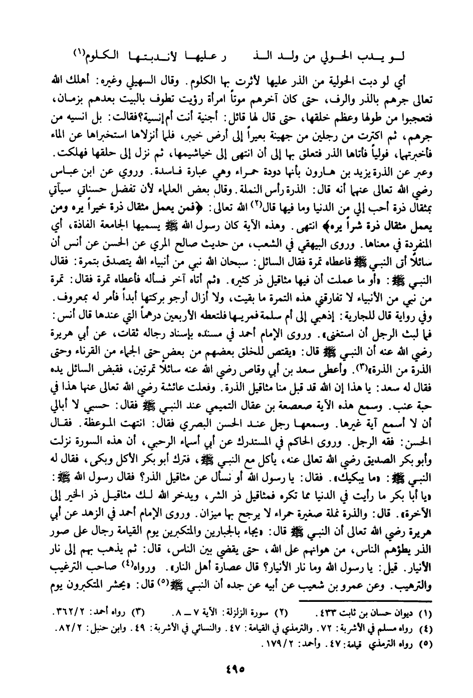 فما لبث الرجل أن استغنى» . وروى الإمام أحمد في مسنده بإسناد رجاله ثقات، عن أبي هريرة رضي الله عنه أن النبي صلى الله عليه وسلم قال: «يقتص للخلق بعضهم من بعض حتى الجماء من القرناء وحتى الذرة من الذرة» «3» . وأعطى سعد بن أبي وقاص رضي الله عنه سائلا تمرتين، فقبض السائل يده فقال له سعد: يا هذا إن الله قد قبل منا مثاقيل الذرة. وفعلت عائشة رضي الله تعالى عنها هذا في حبة عنب. وسمع هذه الآية صعصعة بن عقال التميمي عند النبي صلى الله عليه وسلم فقال: حسبي لا أبالي أن لا أسمع آية غيرها. وسمعها رجل عند الحسن البصري فقال: انتهت الموعظة. فقال الحسن: فقه الرجل. وروى الحاكم في المستدرك عن أبي أسماء الرحبي، أن هذه السورة نزلت وأبو بكر الصديق رضي الله تعالى عنه، يأكل مع النبي صلى الله عليه وسلم، فترك أبو بكر الأكل وبكى، فقال له النبي صلى الله عليه وسلم: «ما يبكيك» . فقال: يا رسول الله أو نسأل عن مثاقيل الذر؟ فقال رسول الله صلى الله عليه وسلم: