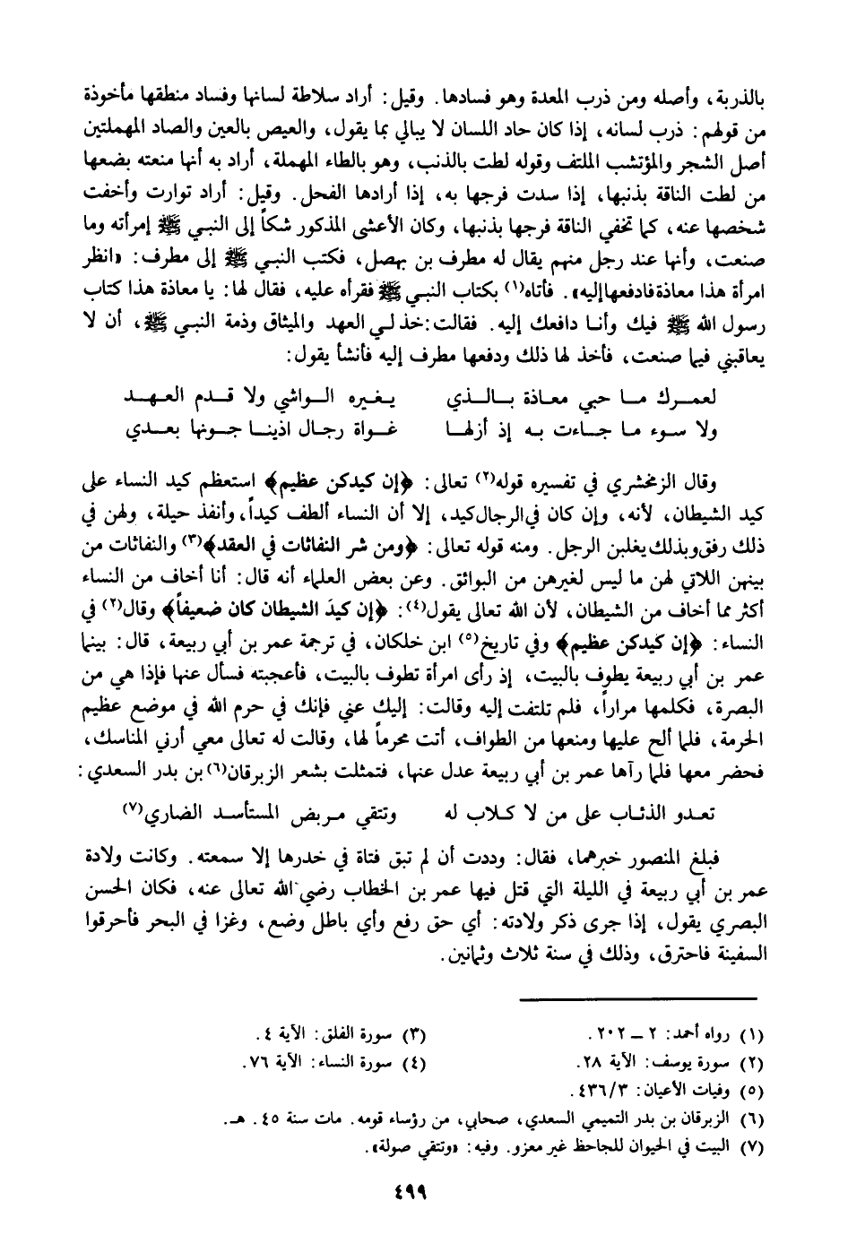 وفي تاريخ «6» ابن خلكان، في ترجمة عمر بن أبي ربيعة، قال: بينما عمر بن أبي ربيعة يطوف بالبيت، إذ رأى امرأة تطوف بالبيت، فأعجبته فسأل عنها فإذا هي من البصرة، فكلمها مرارا، فلم تلتفت إليه وقالت: إليك عني فإنك في حرم الله في موضع عظيم الحرمة، فلما ألح عليها ومنعها من الطواف، أتت محرما لها، وقالت له تعالى معي أرني المناسك، فحضر معها فلما رآها عمر بن أبي ربيعة عدل عنها، فتمثلت بشعر الزبرقان «7» بن بدر السعدي: